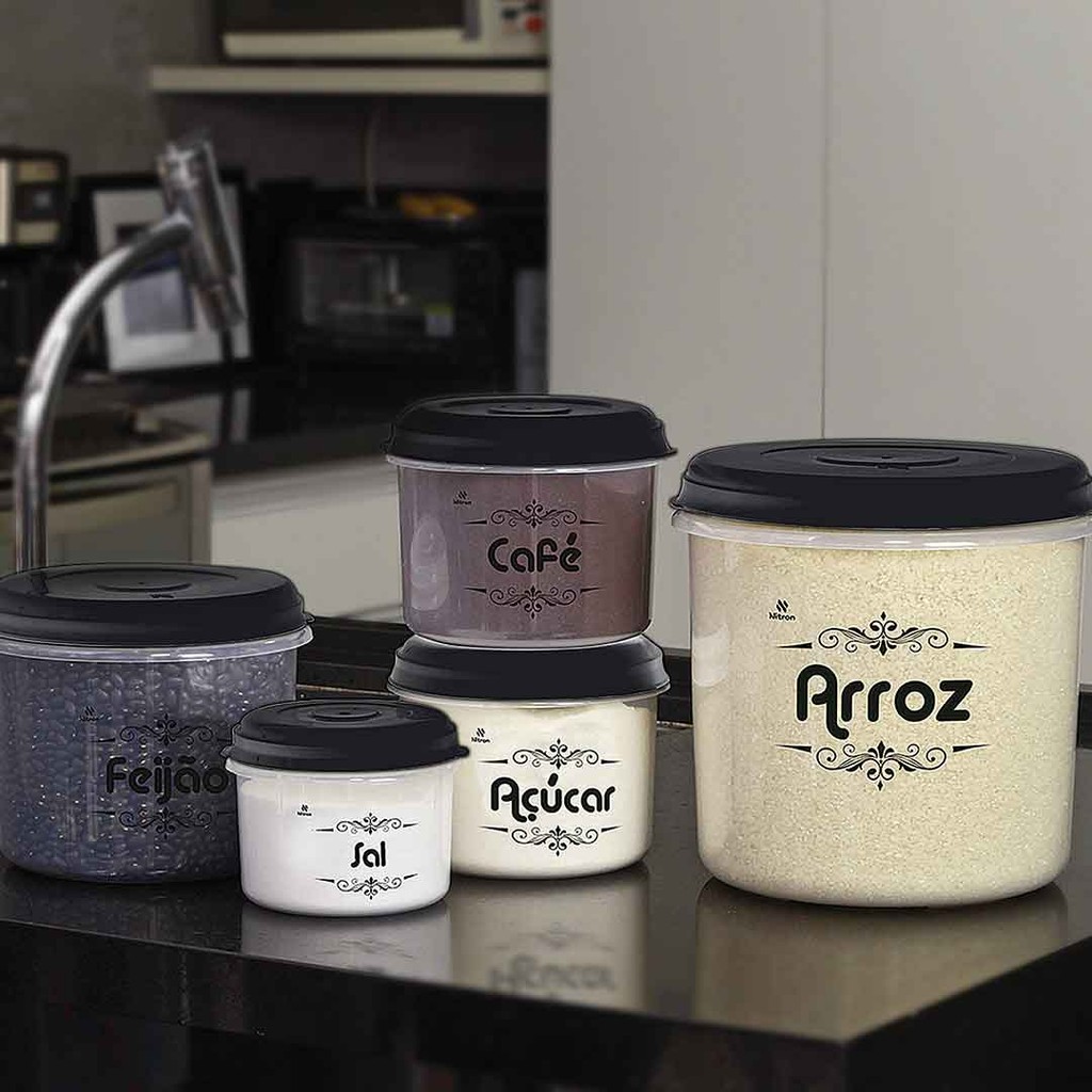 NESTE KIT CONTÊM: - 1 Unidade pote redondo 785 ml (SAL); - 2 Unidade pote redondo 1,6 L (AÇÚCAR E CAFÉ); - 1 Unidade pote redondo 2,9 L (FEIJÃO); - 1 Unidade pote redondo 6,8 L (ARROZ); _______________________________________ DESCRITIVO 785ml: Largura: 12,2 cm Comprimento: 12,2 cm Altura: 9,8 cm Capacidade: 785 ml DESCRITIVO 1,6 L: Largura: 15,6 cm Comprimento: 15,6 cm Altura: 12,7 cm Capacidade: 1,6 Litros DESCRITIVO 2,9 L: Largura: 18,3 cm Comprimento: 18,3 cm Altura: 15,5 cm Capacidade: 2,9 Litros DESCRITIVO 6,8 L: Largura: 22,5 cm Comprimento: 22,5 cm Altura: 23 cm Capacidade: 2,9 Litros _______________________________________ DIFERENCIAIS: BPA Free (Livre de BPA - O BPA é uma substância química que faz mal à saúde) Design alegre que se adequa em todos os momentos Material incrivelmente resistente _______________________________________