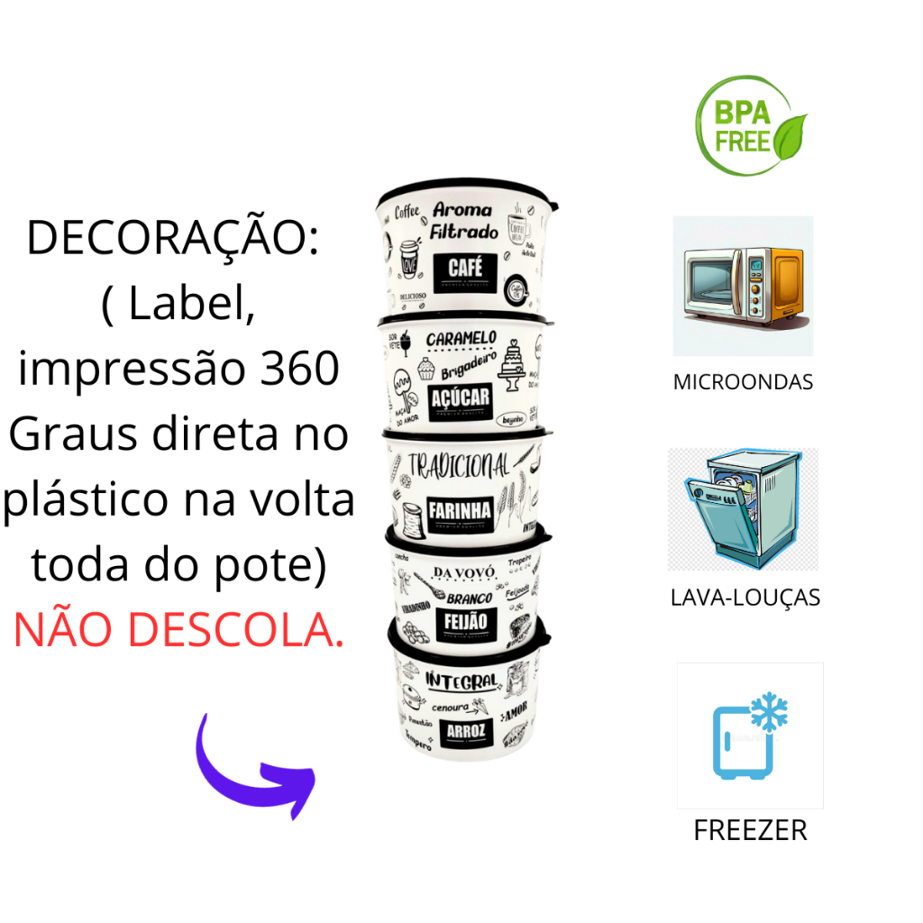 Contem na Caixa: 5-Potes Mantimento todos do ( MESMO TAMANHO ). O Conjunto de Potes vai proporcionar uma decoração linda e muito mais praticidade e organização na sua cozinha! Com 05 potes de tamanhos iguais, você poderá armazenar os mantimentos e mantê-los protegidos por muito mais tempo. O conjunto é confeccionado com material durável. Conjunto De Potes com Decoração simples para melhor identificação dos Mantimentos Ótima vedação e resistência. Potes com tamanho ideal para seus mantimentos. Maior segurança e proteção. Pode ser levado ao micro-ondas, lava louças e freezer. Conservação dos potes: Utilizar apenas detergente, esponja e pano macio NÂO utilizar materiais abrasivos tipo: Scotch Brite e ETC... Medidas Do Conjunto De Potes: Altura: 11,5 Diâmetro Cima: 17,5 Diâmetro Baixo: 15,0 Capacidade: 2 Litros.