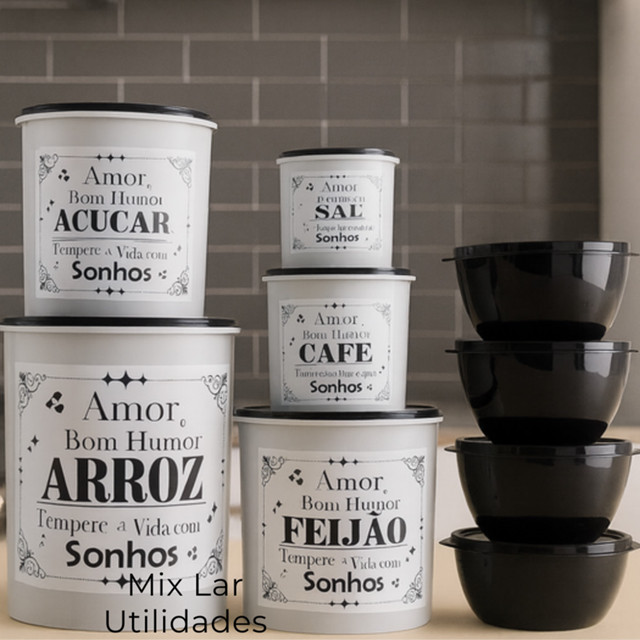 Kit de potes mantimentos 5 Peças + 4 potes bowl para cozinha — MIX LAR UTILIDADES O Kit 5 Mantimentos Cozinha Multiuso Plástico Resistente é um conjunto prático e funcional para organizar e armazenar mantimentos na cozinha. Fabricado em plástico resistente de alta qualidade, este conjunto é durável e fácil de limpar, o que o torna ideal para uso diário. Os potes possuem design elegante e moderno, que combina com qualquer estilo de decoração da cozinha. É uma opção versátil para armazenar diversos tipos de alimentos de açúcar, arroz, feijão, café, Sal. Com este conjunto, sua cozinha ficará mais organizada e prática, facilitando o dia a dia na hora de preparar suas refeições. Tamanhos e Medidas: Pote De Arroz: 24cm x 21cm - 7,2 Litros Pote De Feijão: 19cm x 18cm - 4,0 Litros Pote De Açúcar: 15cm x 15cm - 2,3 Litros Pote De Café: 11cm x 10,5cm - 1,4 Litros Pote De Sal: 13cm x 12,5cm - 800 ML 4 potes com a capacidade de 750 ml. DICAS DE CONSERVAÇÃO: -Não usar esponja de aço. -Lavar com água sabão e esponja macia. - Enviamos em até 24 horas; - Todos os nossos produtos são cuidadosamente embalados para que cheguem em perfeito estado; - Atendimento personalizado para quaisquer dúvidas ou problemas; - Compra 100% Segura. - Qualquer dúvida, nos chame no chat. Nós da equipe MIX LAR UTILIDADES, estamos a disposição para te oferecer todo suporte nas eventuais dúvidas, aqui você encontra a melhor qualidade em produtos para deixar sua casa ainda mais completa e bonita!