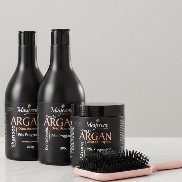 Kit Manutenção Pós Progressiva Maycrene Óleo de Argan - Shampoo + Condic + Máscara + Escova Raquete a Pronta Entrega