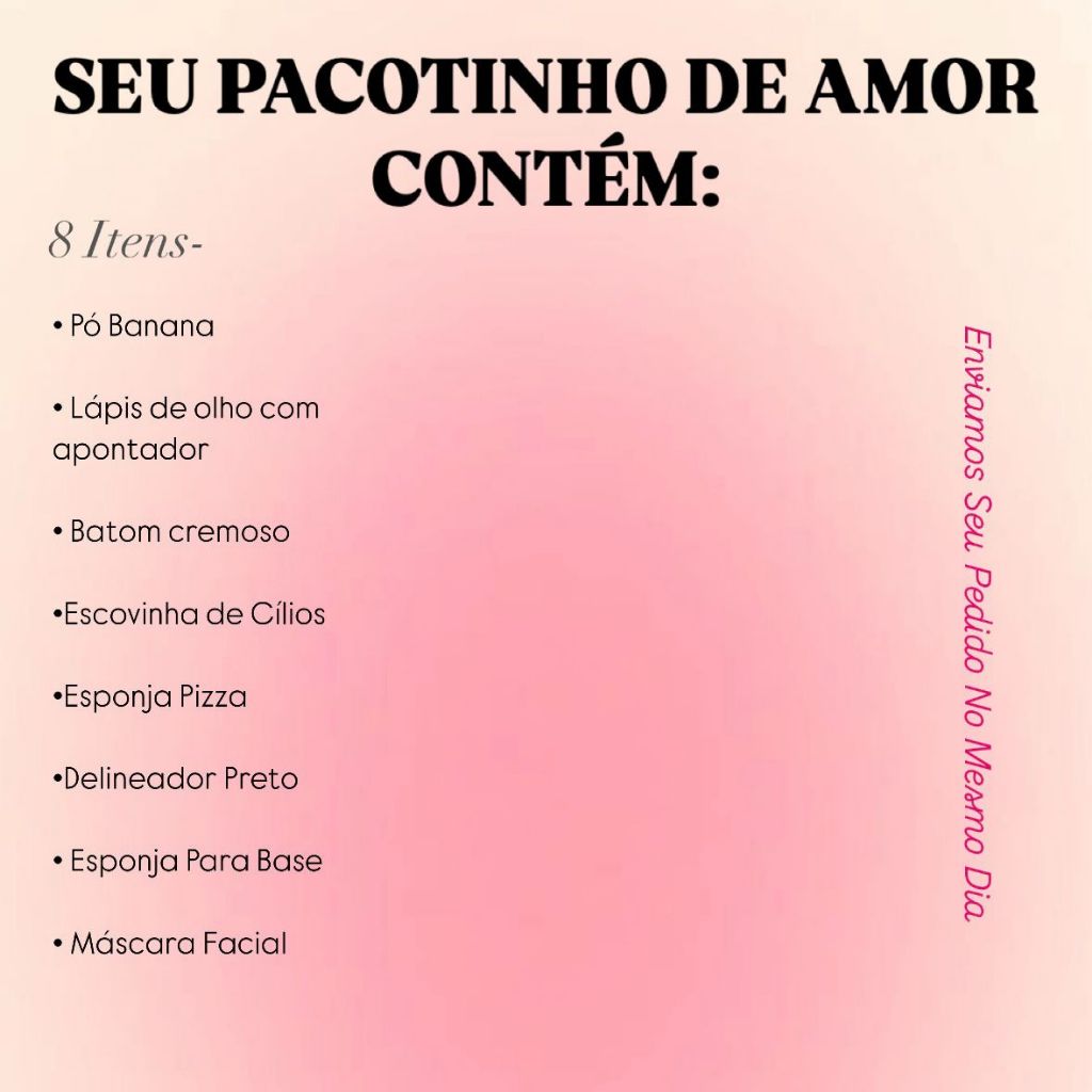 ⸻ Kit de Maquiagem – Escolha o seu Transforme sua make com nossos kits completos, ideais para qualquer ocasião. Três opções exclusivas com itens indispensáveis para você arrasar. Opção 1 – Kit 8 itens: • Pó banana • Lápis de olho • Esponjas para olhos • Escovinha de cílios • Máscaras faciais • Delineador • Esponja para base • Gloss Opção 2 – Kit 17 itens: • Sombra • Pó banana • Rímel • Delineador • Base • Batom matte • Gloss • 3 máscaras faciais • Esponja para base • 3 esponjas triângulo • Navalha • Lápis de olho • Escovinha de cílios Opção 3 – Kit 26 itens: • 7 pincéis • Sombra • Trio de blush, contorno e iluminador • Pó banana • Rímel • Delineador • Base • Batom matte • Gloss • 3 máscaras faciais • Esponja para base • 3 esponjas triângulo • Navalha • Lápis de olho • Escovinha de cílios • Escova Kits prontos para presentear ou montar seu nécessaire completo. ⸻