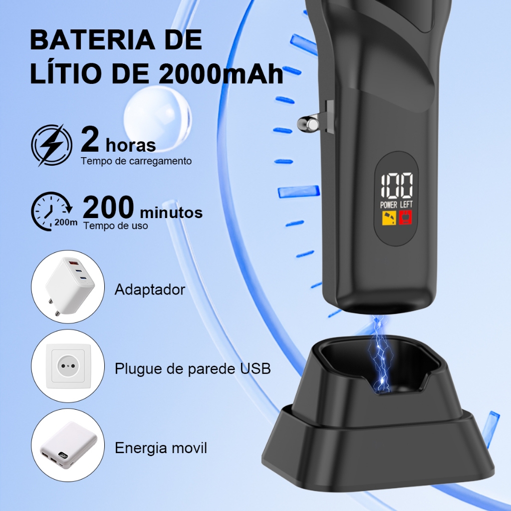 Kit Profissional de Máquinas para Cabelo Lumixar Máquinas para Cortar Cabelo 7800 RPM, Jogo de Cortador e Aparador para Homens com Tela LED, 8 Pentes Guia e Base Cortador de Cabelo para Homens | Cortador Sem Fio | Lâmina T Zero Folga | Tela LCD + Pentes Guia | Kit para Barba | Cortador Doméstico Sem Fio (lâminas afiadas/motor potente/botão one-touch/uso com ou sem fio/lâminas à prova d’água/com base) Conjunto Multifuncional para Corte: O cortador profissional Lumixar foi desenvolvido para cortar cabelo/cuidados capilares/barba e bigode/pelos corporais/perucas (homens, mulheres, crianças, idosos, pets) e uso em barbearias (inclusive para iniciantes). Integra funções de aparador facial para modelar nucas, contornos e bigodes. O cabeçote de corte à prova d’água, durável e removível, facilita a criação de diversos estilos. A tecnologia Zero Folga permite controle preciso do comprimento. Motor Rotativo Potente e Silencioso: Motor de alto torque com 7.800 RPM oferece potência de corte profissional com baixo ruído. Funciona com fio OU sem fio (modo dual). Tela LCD Inteligente: Exibe claramente o status da bateria para recarga no momento certo. Suporta até 4 horas de uso contínuo com carga completa. Base de Carregamento Magnético Exclusiva: Recarga rápida e segura com conexão magnética. Especificações: Tempo de carga: 2 horas Autonomia: 240 minutos Carregamento via cabo USB (incluído): conecte a power banks, adaptadores (5V/2A) ou computadores. Acessórios Inclusos: Nosso kit profissional inclui: Cortador sem fio Lumixar (com base) 8 pentes guia (1,5 mm | 3 mm | 4,5 mm | 6 mm | 9 mm | 12 mm | 16 mm | 19 mm) Escova de limpeza Cabo USB de carregamento Óleo lubrificante profissional Capa protetora Base de carregamento magnético Destaques Técnicos: Bateria Li-Ion 2000mAh Cabeçote profissional em formato T (modelagem versátil) Sistema de velocidade ajustável Botão one-touch para operação simplificada Tela LED para monitoramento da bateria Motor de alto desempenho: estável e seguro Ideal para barbearias e uso doméstico!