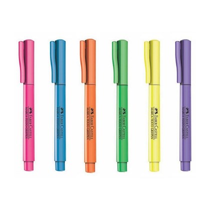 O marca-texto Faber-Castell destaca-se pelas cores vibrantes, seja elas pastel ou neon, sendo cores com beleza raramente vistas. Com ponta resistente, possibilita uma escrita firme, sem afundamento da ponta e maior resistência do marca texto, alongando a sua vida útil. Chanfrada, ela também permite a marcação em traçado duplo: fino para sublinhar e grosso para destacar, sendo marca textos com grande variedade de possibilidades de marcação. Boa aderência, tanto em superfícies de papel comum, quanto de papel fax e cópias, sendo portanto, marca textos de superfícies variáveis, sendo muito bom para quem fica na dúvida no local de marcar. Kit com 6 cores Pastel: Amarelo, Rosa, Laranja, Lilás, Azul e Verde Kit com 6 cores Neon: Amarelo, Rosa, Laranja, Roxo, Azul e verde! Totalizando 12 itens