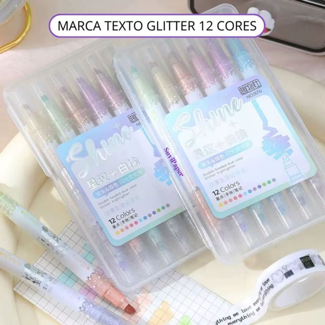 Kit Marca Texto Glitter 12 Cores Shine 6 Marcadores Ponta Dupla Planner, Estudos e Trabalho Marcador de Folhas aparece na subcategoria Marca-texto (de Papelaria) na Shopee Brasil por R$ 24,99 (17% de desconto sobre o preço original de R$ 30,11). Avaliado em 5.0/5 pelos compradores e 2 unidades vendidas, este produto se destaca pelo excelente custo-benefício.