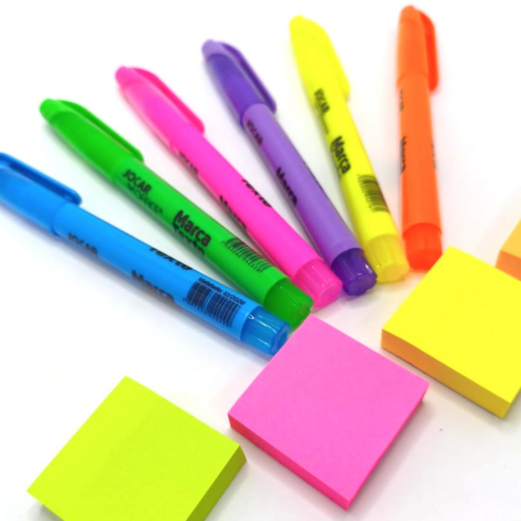 kit marca texto + post it neon 6 marcadores e 4 blocos adesivos