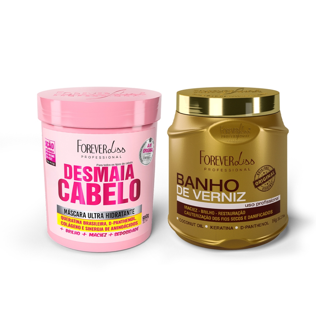 A Máscara Banho de Verniz Forever Liss 1Kg contém princípios ativos que reparam os fios, hidratam e selam as cutículas, de forma a manter os cabelos saudáveis e hidratados por muito mais tempo. A Máscara Ultra Hidratante Desmaia Cabelo Forever Liss 950g foi desenvolvida para proporcionar aos seus cabelos redução de volume e frizz, ao mesmo tempo em que hidrata também proporciona brilho. Indicação: Indicado para todos os tipos de cabelos, principalmente os ressecados, com frizz, volume em excesso, opacos e sem vida. Modo de uso: Banho de Verniz: 01. Logo após lavar os cabelos com o Shampoo Banho de Verniz, aplique a Máscara Banho de Verniz nos fios ainda úmidos, espalhando em todo o comprimento; 02. Enluve mecha a mecha; 03. Deixe agir por 10 minutos. Se desejar, pode usar touca térmica para potencializar o resultado; 04. Enxágue até retirar o produto por completo; 05. Finalize como desejar; Para um melhor resultado utilize a Linha completa Banho de Verniz Forever Liss. Desmaia Cabelo: 01. Aplique a Máscara Desmaia Cabelo com os cabelos úmidos em todo o comprimento do fio, pentear até que perceba uniformidade na aplicação; 02. Deixe agir de 5 a 15 minutos; 03. Enxágue normalmente e finalize como desejar. Contém: 01 - Máscara Banho de Verniz Forever Liss 1Kg 01 - Máscara Ultra Hidratante Desmaia Cabelo Forever Liss 950g Precauções: Manter em lugar fresco e ao abrigo de luz. Uso externo adulto. Em caso de contato acidental com os olhos, enxaguar abundantemente. Havendo irritação suspenda o uso. Caso a irritação persista, procure orientação médica. Não ingerir, manter fora do alcance de crianças e animais domésticos. Principais Dúvidas: 01. Qual é o pH das máscaras? R. O pH dos produtos são: Máscara Banho de Verniz Forever Liss 1Kg: 3,8 - 5,2. Máscara Ultra Hidratante Desmaia Cabelo Forever Liss 950g: 3,8 - 5,2. 02. Os dois produtos entram em qual etapa do cronograma capilar? R. Ambos produtos entram na etapa de hidro-reconstrução.