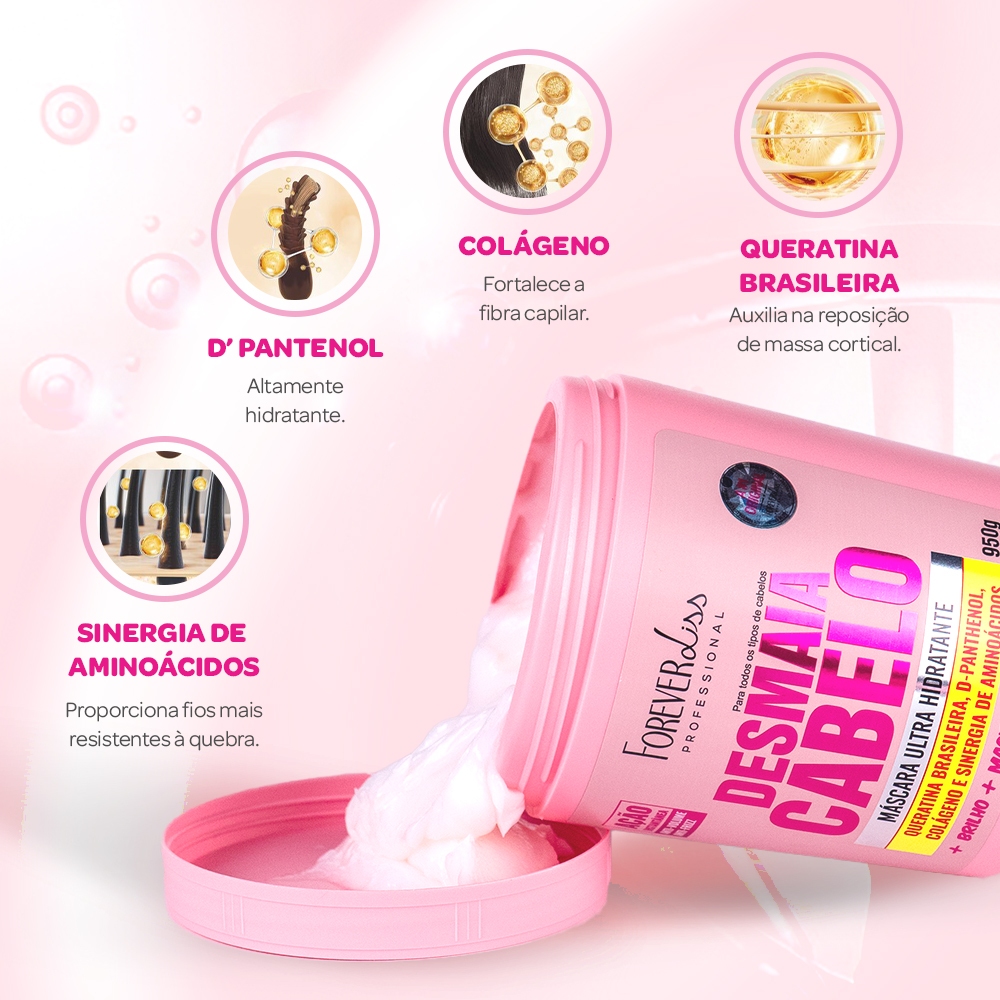 A Máscara Banho de Verniz Forever Liss 1Kg contém princípios ativos que reparam os fios, hidratam e selam as cutículas, de forma a manter os cabelos saudáveis e hidratados por muito mais tempo. A Máscara Ultra Hidratante Desmaia Cabelo Forever Liss 950g foi desenvolvida para proporcionar aos seus cabelos redução de volume e frizz, ao mesmo tempo em que hidrata também proporciona brilho. Indicação: Indicado para todos os tipos de cabelos, principalmente os ressecados, com frizz, volume em excesso, opacos e sem vida. Modo de uso: Banho de Verniz: 01. Logo após lavar os cabelos com o Shampoo Banho de Verniz, aplique a Máscara Banho de Verniz nos fios ainda úmidos, espalhando em todo o comprimento; 02. Enluve mecha a mecha; 03. Deixe agir por 10 minutos. Se desejar, pode usar touca térmica para potencializar o resultado; 04. Enxágue até retirar o produto por completo; 05. Finalize como desejar; Para um melhor resultado utilize a Linha completa Banho de Verniz Forever Liss. Desmaia Cabelo: 01. Aplique a Máscara Desmaia Cabelo com os cabelos úmidos em todo o comprimento do fio, pentear até que perceba uniformidade na aplicação; 02. Deixe agir de 5 a 15 minutos; 03. Enxágue normalmente e finalize como desejar. Contém: 01 - Máscara Banho de Verniz Forever Liss 1Kg 01 - Máscara Ultra Hidratante Desmaia Cabelo Forever Liss 950g Precauções: Manter em lugar fresco e ao abrigo de luz. Uso externo adulto. Em caso de contato acidental com os olhos, enxaguar abundantemente. Havendo irritação suspenda o uso. Caso a irritação persista, procure orientação médica. Não ingerir, manter fora do alcance de crianças e animais domésticos. Principais Dúvidas: 01. Qual é o pH das máscaras? R. O pH dos produtos são: Máscara Banho de Verniz Forever Liss 1Kg: 3,8 - 5,2. Máscara Ultra Hidratante Desmaia Cabelo Forever Liss 950g: 3,8 - 5,2. 02. Os dois produtos entram em qual etapa do cronograma capilar? R. Ambos produtos entram na etapa de hidro-reconstrução.