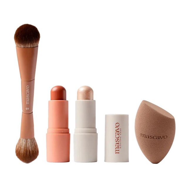 O Kit Contém: 1 Mascavo Pro Series 01 Pincel de Maquiagem Duplo para Rosto 1 Mascavo Glow Stick Iluminador em Bastão Champagne - 6g 1 Mascavo Flush Stick Blush em Bastão Maple - 6g 1 Mascavo Problender Esponja de Maquiagem Grande
