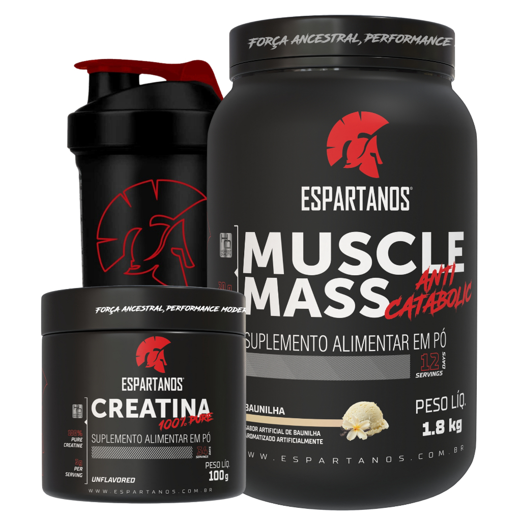 Kit Massa Hipercalórico MUSCLE MASS + Creatina 100g + Coqueteleira - Espartanos