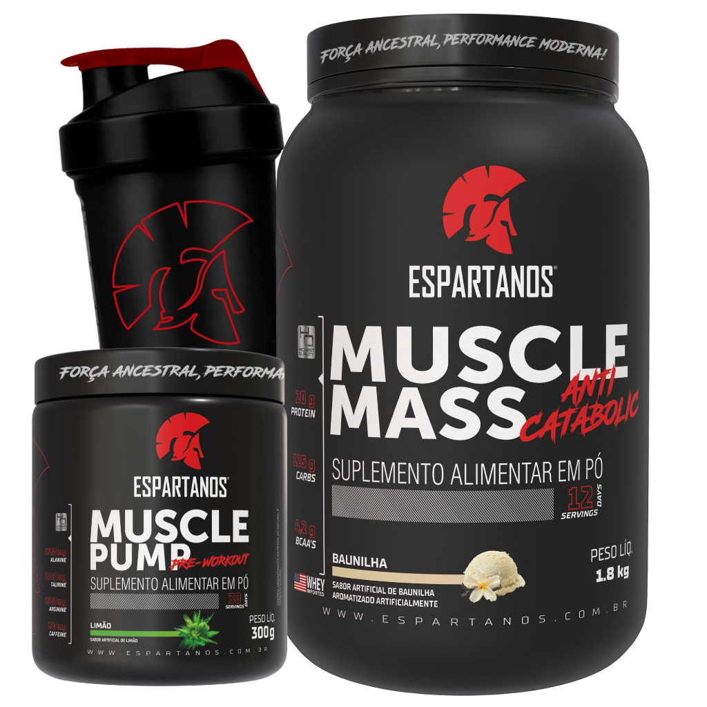 Kit Massa Hipercalórico MUSCLE MASS + Pré Treino Muscle Pump + Shaker