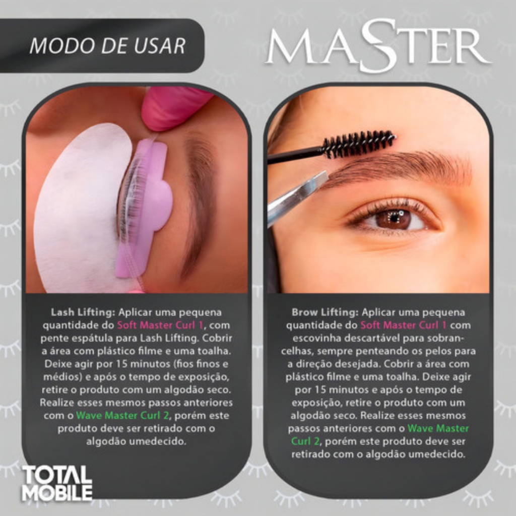 ITENS INCLUSOS: - Passo 1 e Passo 2 - Master Premium Wave e Soft Pro-Curl 15g. DESCRIÇÃO: O creme Master Premium Soft Pro-Curl, Passo 1, contém aminoácidos que ajudam a suavizar e flexibilizar os fios. O creme Master Premium Wave Pro-Curl, Passo 2, atua como fixador e neutralizador de curvatura dos fios da sobrancelha e dos cílios, contém aminoácidos, tornando assim mais rápida a ação do lifting. Os Passos 1 e 2 fazem parte do conjunto Master Premium Lash Lifting, o tratamento completo para Lifting de cilios. Ambos podem ser usados para duas técnicas, o Brow Lamination que consiste em alinhar e dar volume aos fios naturais da sobrancelha. E o Lash Lifting que consiste em alongar os fios naturais os cílios, dando um aspecto de maiores e mais curvados. MODO DE USAR: - Lash Lifting: Aplicar uma pequena quantidade do Wave Master Curl 1, com pente espátula para Lash Lifting. Cobrir a área com plástico filme e uma toalha. Após a aplicação do Passo 1 utilize o Passo 2 para atuar como fixador e neutralizador de curvatura dos fios da sobrancelha e dos cílios. Para ambos os passos, deixe agir por 15 minutos e após o tempo de exposição, retire o produto com um algodão umedecido com água. - Brow Lifting (Lamination): Aplicar uma pequena quantidade do Soft Master Curl 1 com escovinha descartável para sobrancelhas, sempre penteando os pelos para direção desejada. Cobrir a área com plástico filme e uma toalha. Deixe agir por 15 minutos e após o tempo de exposição, retire o produto com um algodão seco. Após a aplicação do Passo 1, utilize o Passo 2 da mesma maneira, respeitando o processo de atuação do produto. RECOMENDAÇÕES: O produto deve ser aplicado por uma profissional da área. Fazer teste de irritabilidade e sensibilidade antes do procedimento. REGISTRO ANVISA: Passo 1: 25351200338/2018-48 Passo 2: 25351200330/2018-81 MODO DE ARMAZENAGEM Evitar mudanças excessivas de temperatura. Manter o produto em local fresco e protegido de luz. Após o uso, manter a tampa fechada. Evitar exposição a luz do sol.