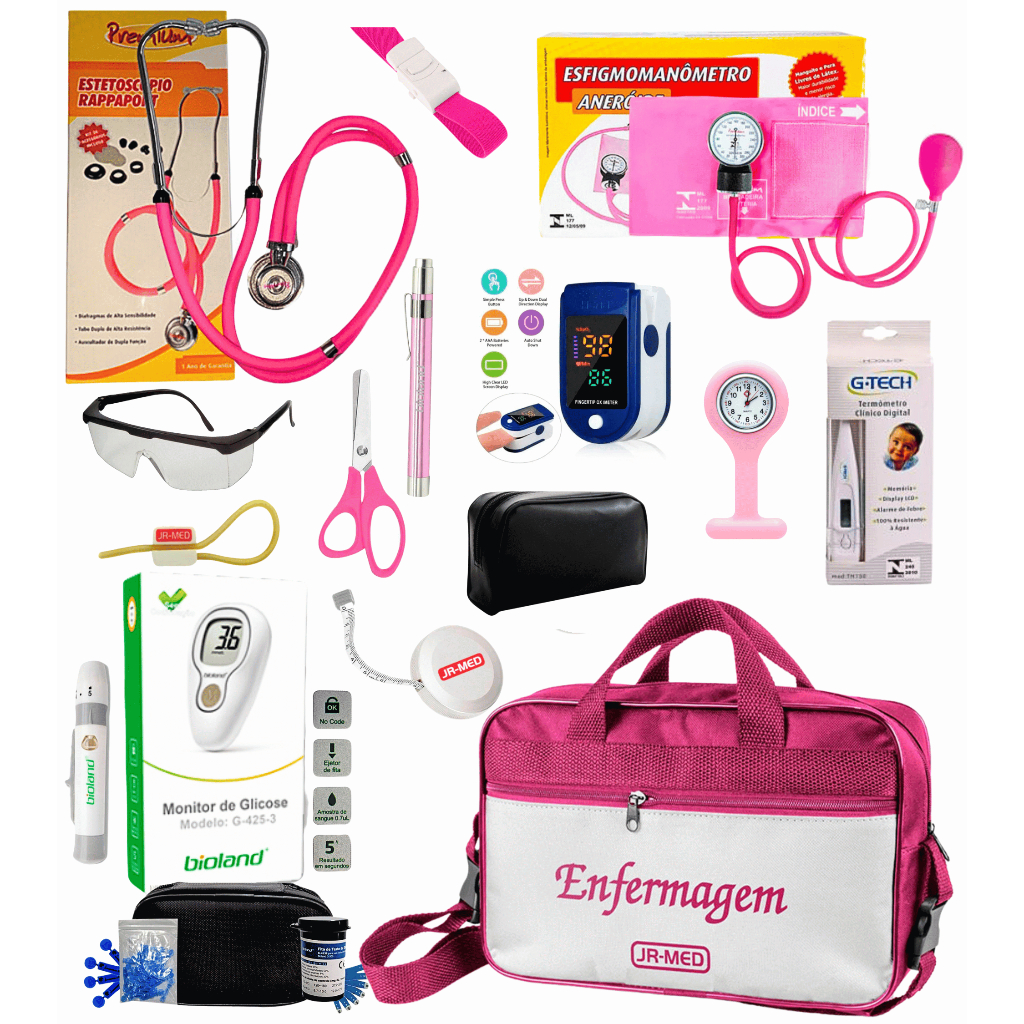 Nossos Aparelhos são revisados antes de ser enviado aos nossos clientes. Caso tenha dúvidas ou dificuldade no seu manuseio, entrar em contato conosco pelos canais de atendimento. É um aparelho de uso profissional que requer treinamento e prática para o uso correto; Conteúdo do Kit: 01 Esfigmomanômetro de Velcro com selo do Inmetro - Marca Premium/ P A MED/ INCOTERM 01 Estetoscópio Rappaport Adulto/ Pediátrico com certificado da Anvisa - Marca Premium / P A MED / INCOTERM 01 Garrote de látex 01 Termômetro Clinico Digital 01 Garrote de Presilha (cores conforme estoque ) 01 Óculos de Proteção 01 Tesoura Mundial Sem Ponta (cores conforme estoque ) 01 Relógio de Lapela ( cores conforme estoque) 01 Trena Métrica 150 CM Branca JR-MED 01 Lanterna Clinica ( pilhas não inclusas) Medidor De Glicose Itens Incluso: 01 Medidor de Glicose BIOLAND 01 Caneta Lancetadora 25 Tiras de Teste 25 Lancetas 02 Pilhas AAA 01 Estojo 01 Manual de Instruções Idioma Português Itens inclusos: 1 Oxímetro De Pulso Fingertip 1 Cordão. 1 Manual de instruções Bolsa Tamanho Aproximado: 22 cm altura X 30 cm largura X 9 cm profundidade Atenção Cliente: Aparelho, Estetoscópio e Bolsa, Prevalece a cor do kit. Acessórios, enviamos cores conforme estoque Foto meramente ilustrativa, podendo alterar a cor conforme lote do produto.