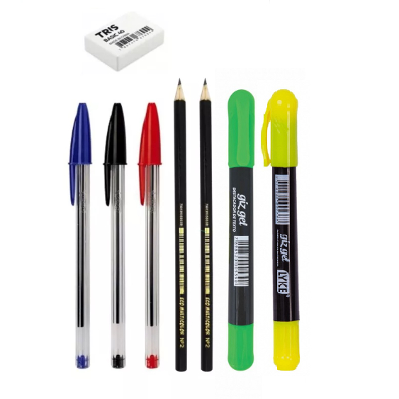 Kit Perfeito para Estudo de ensino médio e faculdade. Envio de capas do caderno aleatória ESPECICAÇÕES : *estojo não é incluso* 1 Caderno Pepper Tilibra 10 Matérias 160 folhas bolsa plástica (ENVIO DE CAPAS ALEATÓRIO) 3 Canetas Bic - Azul, Preto e Vermelho 2 Lápis Grafite 2B 2 Marca Texto 1 Borrachas Basic