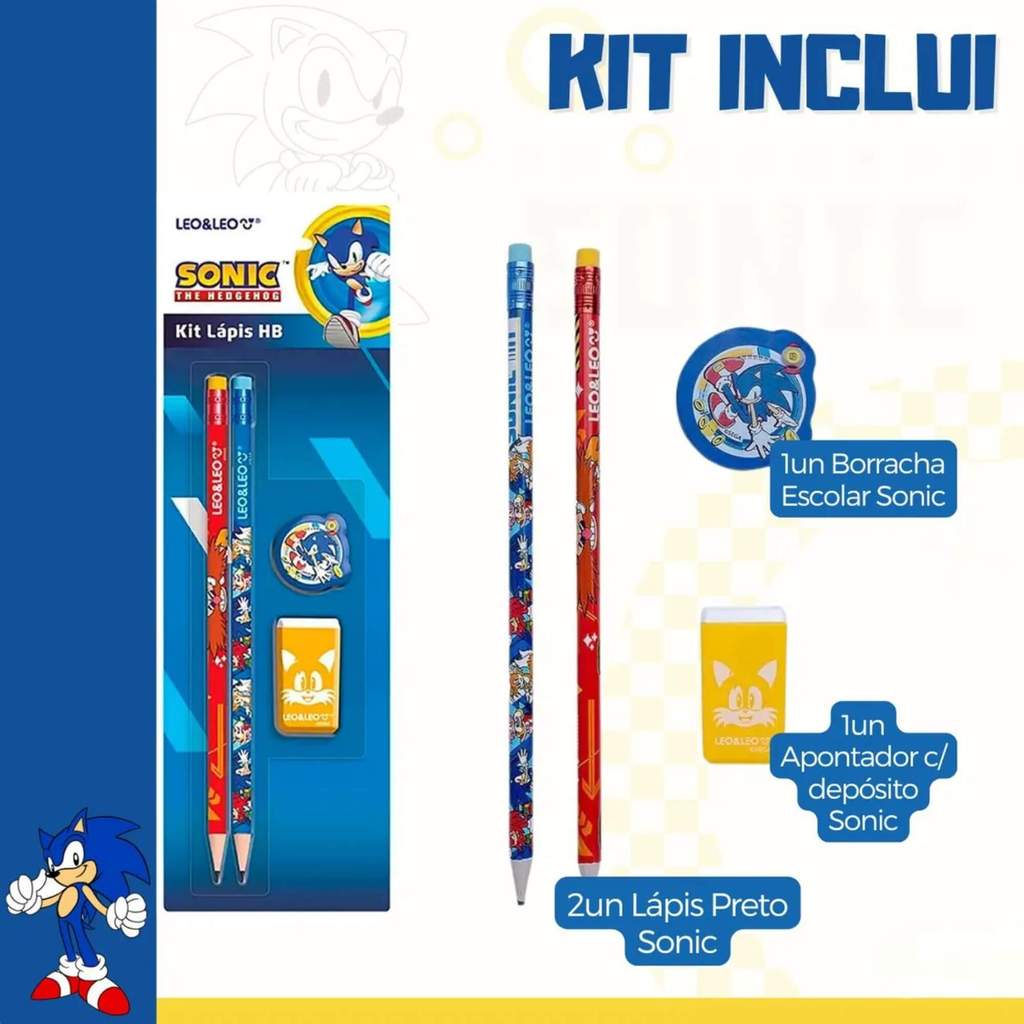 Kit Material Escolar Sonic 2 Lápis HB + Apontador + Borracha + Estojo Tubo c/ Patch