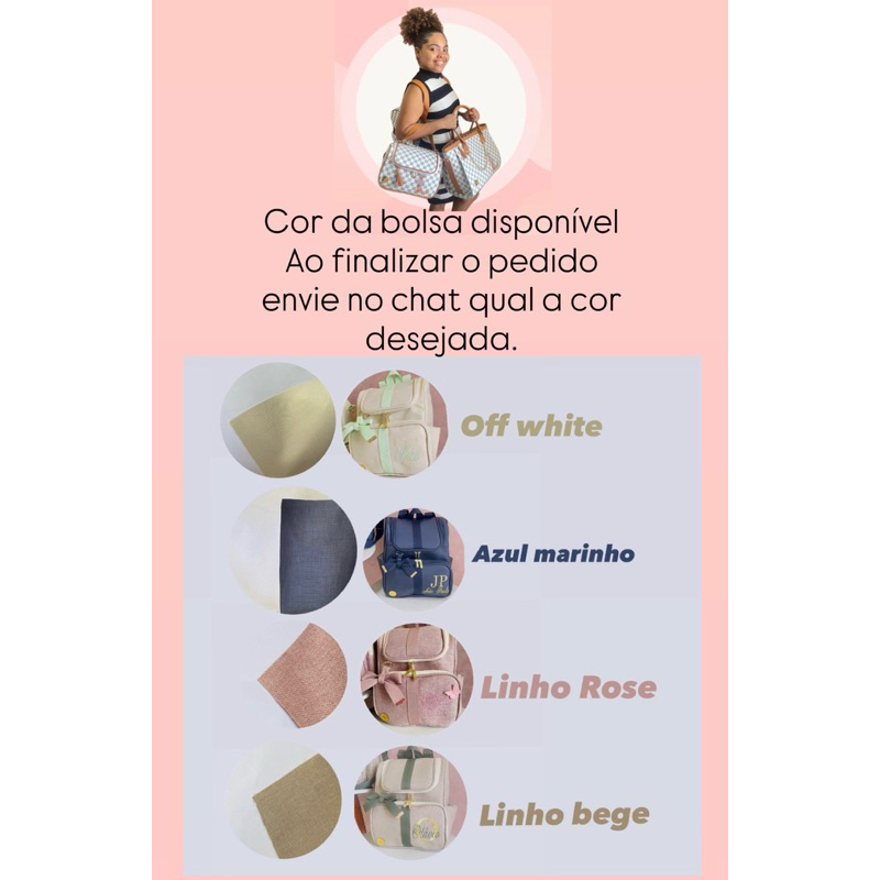 belíssimas bolsas personalizadas trabalhamos a 5 anos realizando sonhos das mamães a ter suas peças personalizadas!!! consulta as cores disponíveis antes de fecha o pedido 01 mala diamante 01 mochila com nome do bebê assim que finalizar o pedido enviar o nome do bebê e cor desejada bolsas na cor bege , azul marinho, linho cinza alça rose alça azul marinho alça rosa bebê alça vermelha caso não informe em até 7 dias a peça seguirá sem persona