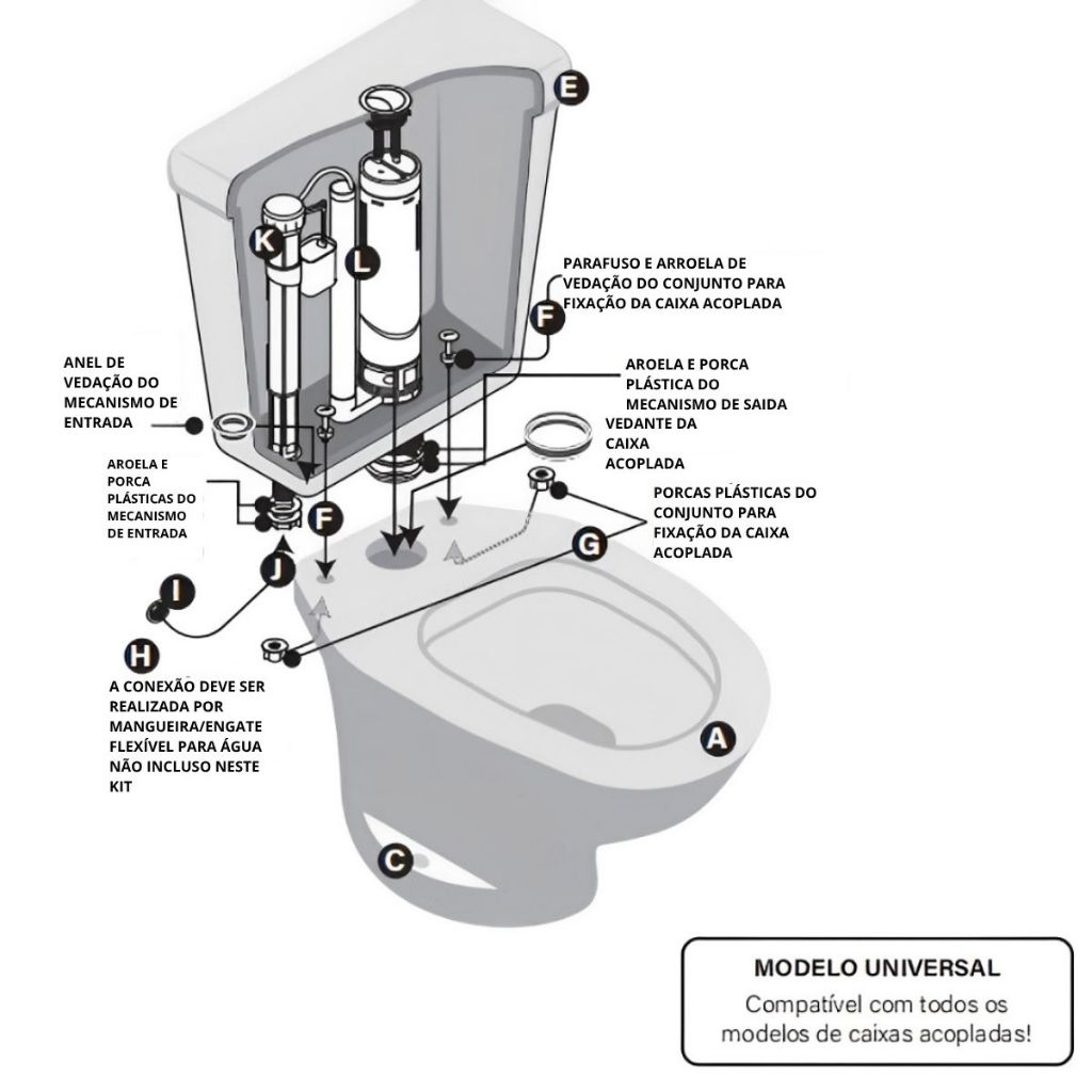 Kit Mecanismo de Descarga Universal Completo para Caixa Acoplada Reparo Interno para Vaso Sanitário Pare o vazamento, o barulho e o desperdício de água Se a sua descarga não para de correr, faz barulho constante ou está aumentando sua conta de água, provavelmente o problema está no mecanismo interno da caixa acoplada. Com o tempo, peças internas como válvula de entrada, boia e mecanismo de saída sofrem desgaste, causando vazamentos, enchimento contínuo da caixa e mau funcionamento da descarga. O Kit Mecanismo de Descarga Universal Completo é a solução prática para restaurar o funcionamento correto da caixa acoplada, evitando desperdício de água e resolvendo o problema de forma rápida e econômica. A instalação é simples e o kit substitui o conjunto interno da caixa acoplada, dispensando obras ou adaptações complicadas. Problemas que este kit resolve Descarga vazando sem parar Água correndo constantemente no vaso sanitário Barulho dentro da caixa acoplada Enchimento irregular da caixa Desperdício de água e aumento na conta Mau funcionamento da descarga Compatibilidade Este kit de mecanismo para caixa acoplada é modelo universal, compatível com a maioria das caixas acopladas convencionais do mercado. Compatível com diversas marcas populares, como: Deca Celite Roca Incepa Icasa Docol Lorenzetti Fiori Eternit Astra Hervy Logasa Fabrimar Compatível também com diversas outras marcas nacionais e importadas que utilizam caixa acoplada convencional. Não compatível com vasos sanitários monobloco. Características do Produto Modelo universal Sistema anti-vazamento Boia regulável para controle do nível de água Ajuste simples de altura Instalação rápida e prática Material resistente e durável Kit completo para reposição interna da caixa acoplada Benefícios Economia real de água no uso diário Funcionamento correto da descarga do vaso sanitário Redução de vazamentos e desperdício Manutenção simples e eficiente Excelente custo-benefício Solução prática para reparo hidráulico do banheiro O que acompanha o kit Mecanismo de saída de descarga Válvula de entrada de água Boia regulável Conjunto interno completo para caixa acoplada Produto pronto para instalação. Indicado para Banheiros residenciais Apartamentos Reformas e manutenções hidráulicas Substituição de mecanismo desgastado ou danificado Reparo de vazamentos na caixa acoplada Resultado após a instalação Após a troca do mecanismo, a caixa acoplada volta a funcionar corretamente, eliminando vazamentos, barulhos e desperdício de água, trazendo mais eficiência e economia no uso diário do vaso sanitário. Informações adicionais Produto novo Envio rápido e embalagem segura Dica importante: Trocar o mecanismo interno da caixa acoplada no momento certo evita desperdício contínuo de água e pode reduzir significativamente o valor da conta mensal.