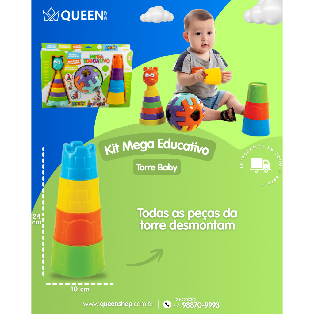 Kit Mega Educativo Pedagógico - Torre de Montar, Bola Geométrica e Urso Encaixável - 23 Peças Para o Desenvolvimento Infantil Descrição do Produto: O Mega Educativo Pedagógico é um brinquedo educativo composto por 23 peças coloridas e didáticas, criado para promover o desenvolvimento infantil. Este conjunto oferece diversas atividades que ajudam a estimular a coordenação motora, a atenção, a concentração e a compreensão de causa e efeito. Além disso, incentiva a imaginação e a criatividade das crianças, tornando o aprendizado uma experiência divertida e envolvente. Componentes do Conjunto: Urso Encaixável com 7 Peças: 1 Ursinho 6 Anéis coloridos para empilhar, numerados e com letras. Torre de Montar com 4 Peças: 1 Torre 4 Peças coloridas para encaixar. Bola Geométrica Encaixável com 12 Peças: 1 Bola M 6 Formas geométricas diferentes para encaixar. Resumo: Os brinquedos educativos do Mega Educativo são perfeitos para transformar o aprendizado em uma aventura super divertida. Com peças coloridas e formatos variados, as crianças podem desenvolver habilidades essenciais enquanto brincam. Contém: 1 Torre 1 Bola M 1 Urso 6 Forminhas Geométricas Desenvolvimento: Atenção e Concentração: As atividades propostas pelo brinquedo ajudam a criança a focar e prestar atenção em detalhes. Compreensão de Causa e Efeito: Encaixar e empilhar as peças permite à criança entender a relação entre suas ações e os resultados. Coordenação Motora: Manipular as peças coloridas e de diferentes formas promove o desenvolvimento da coordenação motora fina. Imaginação e Criatividade: A combinação de formas e cores estimula a criatividade e a capacidade imaginativa das crianças. Transforme o aprendizado em uma experiência lúdica e educativa com o Mega Educativo Pedagógico! Indicado para crianças a partir de 12 meses.