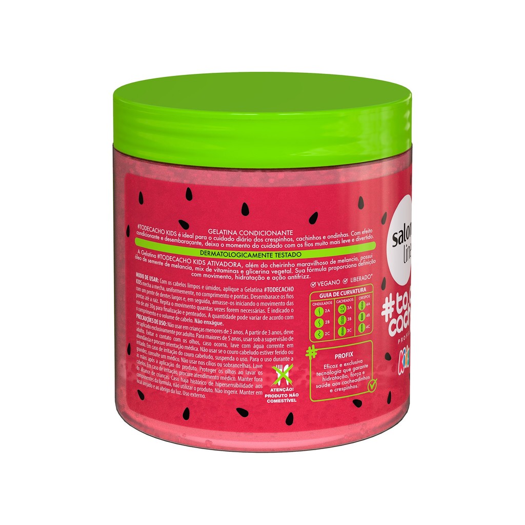 O Kit contém 1 Spray Perfumado Cabelo & Corpo Melancia Salon Line Kids 200ml, 1 Creme Para Pentear Melancia Kids Cachinhos Definidos 500g e 1 Gelatina Melancia #todecacho Kids Ativadora 550g e 1 Óleo Reparador Melancia Cachos dos Sonhos Multy Poderosos 50ml. O combo completo para deixar você e seus cabelos ainda mais incríveis com cheirinho de melancia. <>INDICAÇÕES$& Para quais tipos de cabelo? Para cabelos ondulados, cacheados e crespos. Qual a indicação? Para cabelos ressecados, com frizz, sem volume e sem definição. Pode usar a partir de quantos anos? A partir de 12 anos. <>ATIVOS$& Quais os principais ativos? Spray Perfumado Cabelo & Corpo Melancia Kids Com cheirinho maravilhoso de melancia, possui óleo de semente de melancia, mix de vitaminas e glicerina vegetal. Sua fórmula suave proporciona brilho aos cabelos sem pesar e perfumação imediata. Creme Para Pentear Melancia Kids Cachinhos Definidos Kids Óleo de semente de melancia: rico em vitaminas A, C e B6 e nutrientes, garante hidratação profunda e realce do brilho dos fios. Além disso, auxilia na formatação dos cachos sem pesar. Óleo de macadâmia: nutre o cabelo e ajuda a controlar o volume e a formação do frizz. Além disso, tem ação regenerativa, hidratante e reconstrutora, melhorando a elasticidade e condicionando por mais tempo. Óleo de coco: rico em vitaminas para os fios e ácidos graxos, fortalece os fios e proporciona brilho e maciez extrema. Gelatina Melancia #todecacho Kids Ativadora Conta com óleo de Semente de Melancia, Mix de Vitaminas e Glicerina Vegetal que, juntos, proporcionam movimento, hidratação e ação antifrizz. Óleo Reparador Melancia Cachos dos Sonhos Multy Poderosos É especialmente enriquecido com óleo de melancia, óleo de argan, D-pantenol e mix de aminoácidos, ativos hidratantes e nutritivos. <>MODO DE USO$& Qual a melhor forma de usar? Spray Perfumado Cabelo & Corpo Melancia Kids Borrife o Spray na pele e nos cabelos, úmidos ou secos, mantendo uma distância mínima de 15 cm. Reaplique sempre que desejar. DICA: Para intensificar o aroma de melancia por muito mais tempo nos cabelos, utilize também os produtos da linha Gelatina Melancia Kids Ativadora e Creme para Pentear Kids Cachinhos Definidos de Melancia. Creme para Pentear Kids Cachinhos Definidos de Melancia e Gelatina Melancia Kids Ativadora Para ter um resultado impecável, sugerimos que a finalização seja sempre com os cabelinhos molhados, fazendo a divisão em mechas para uma aplicação uniforme. Evite sobrepor os produtinhos É importante evitar a sobreposição dos produtos com cor ao reaplicá-los. O acúmulo de produto pode levar a uma pigmentação excessiva dos fios. O ideal é a remoção completa dos finalizadores coloridos aplicados anteriormente antes de proceder com uma nova aplicação no dia a dia. Cuidado com roupas claras! Utilizar sempre alguma proteção na hora da aplicação como toalhas escuras, para evitar a pigmentação de tecidos claros. Óleo Reparador Melancia Cachos dos Sonhos Com o cabelo seco ou úmido, aplique algumas gotas do óleo reparador na palma das mãos e espalhe bem do comprimento às pontas. Finalize como preferir. Sem enxágue.