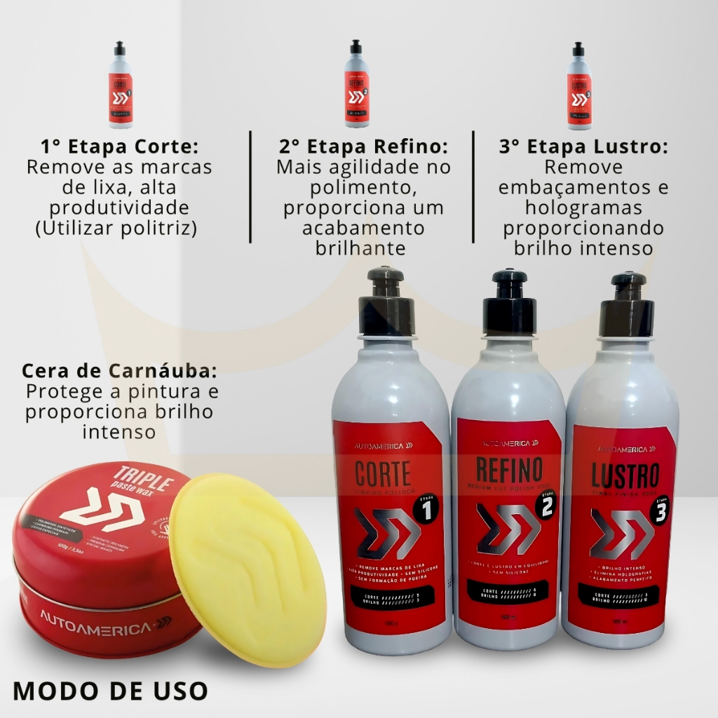 Kit Menzerna Polimento corte 100 refino 2000 lustro 3000 Cera Cristalizadora Triple Wax 100g