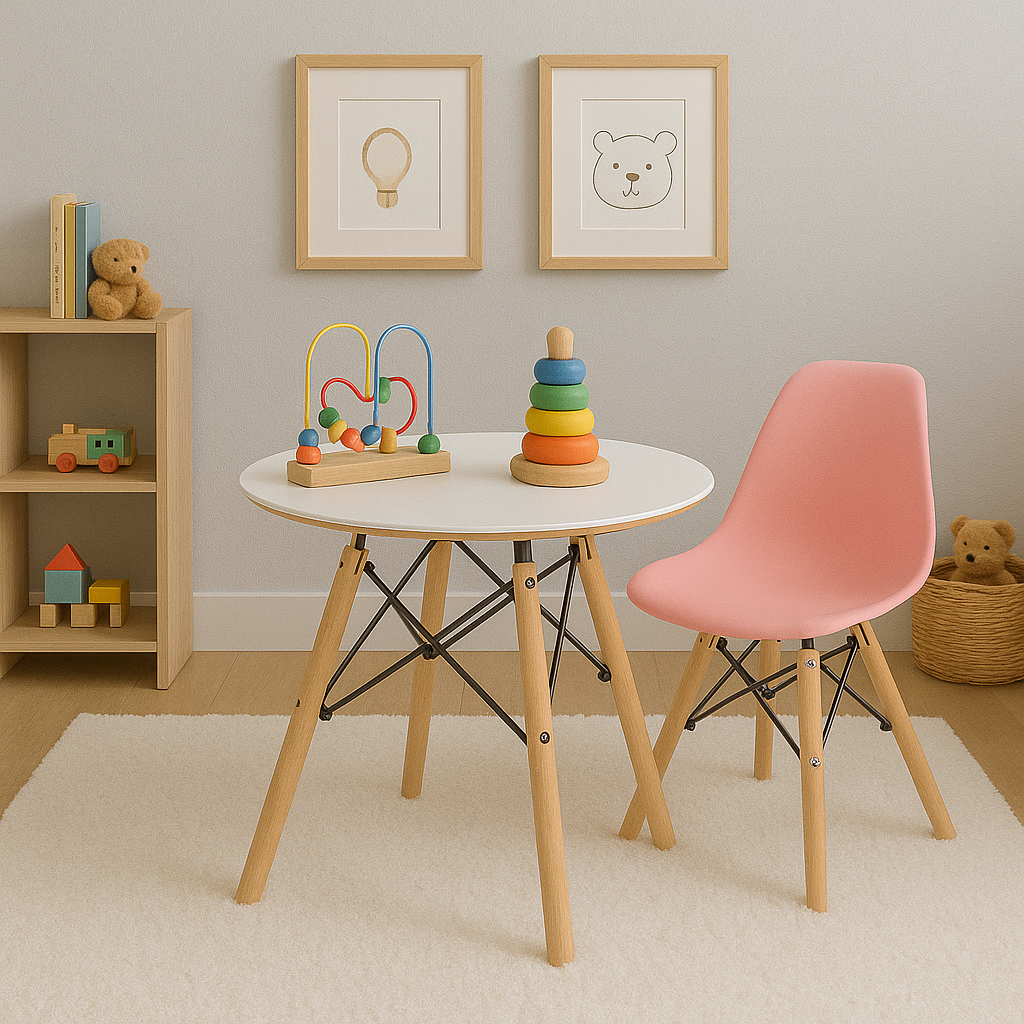 DESCRIÇÃO TÉCNICA MESA INFANTIL Material: Madeira e Metal Pés em Madeira e metal Dimensões (LxPxA) : 60 x 60 x 40cm Altura do Tampo: 40 cm Peso: 7 Kg Peso Máximo Suportado: 40 Kg DESCRIÇÃO TÉCNICA CADEIRA INFANTIL Material: Polipropileno Pés em Madeira e metal Dimensões (LxPxA) : 30 x 36 x 55cm Altura do Assento: 31 cm Peso: 1.7 Kg Peso Máximo Suportado: 40 Kg OBS: CONJUNTO INFANTIL! RECOMENDADO PARA CRIANÇAS DE ATÉ 4 ANOS INFORMAÇÕES DO PRODUTO A combinação perfeita para o quarto dos pequenos a mesa infantil eames, com as cadeiras será sim a estrela da decoração. Ela possui um lindo design minimalista com pés palitos e extremamente charmosos. O formato redondo é o mais cotado para todos os espaços desde pequeno ou grande, pode ser utilizada para refeições ou apenas para diversão! Já as cadeiras são inspiradas no clássico do design mundial assinado pelo icônico casal de designers norte-americanos Charles e Ray Eames. A cadeira mostra o perfeito equilíbrio entre formas, ergonomia e volumes dos móveis das décadas de 1940 e 1950. Confortável e com desenho atemporal, ela decora diversos ambientes com charme e sofisticação. Dica: Misture as cores das cadeiras ao seu gosto!