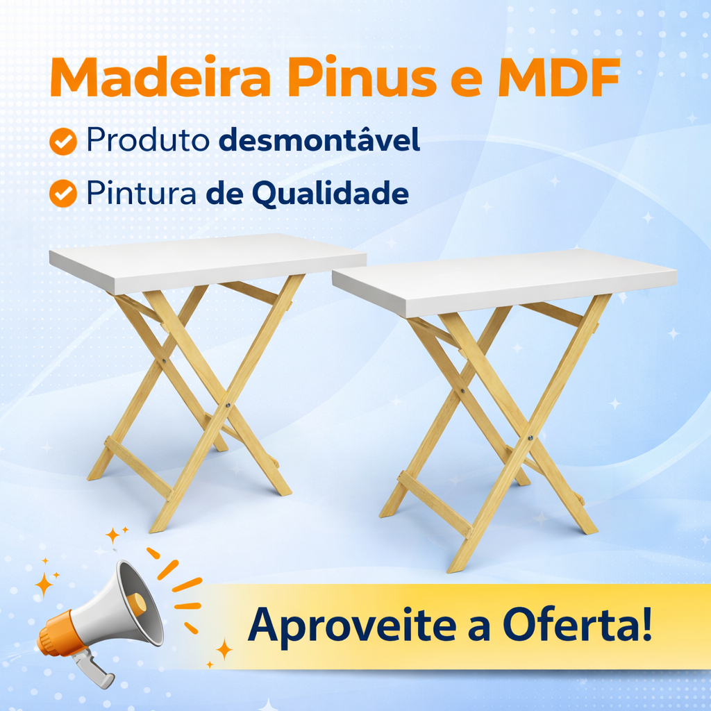 📏 Medidas e Material Altura: 80 cm | Largura: 35 cm | Comprimento: 70 cm Material: Estrutura em madeira pinus natural + tampo em MDF pintado ⚠️ ATENÇÃO: Verifique as medidas antes da compra. Itens decorativos não acompanham o produto. ✨ Conjunto com 2 Mesas Cavalete Desmontáveis Perfeitas para decoração de festas, aniversários, eventos, vitrines ou uso residencial, essas mesas unem beleza, praticidade e funcionalidade. Ideais para quem trabalha com aluguel de móveis pegue e monte ou deseja um ambiente moderno e organizado. A estrutura em madeira pinus natural garante resistência e leveza, enquanto o tampo em MDF com pintura de alta qualidade proporciona acabamento liso, elegante e fácil de limpar. Um produto versátil que combina com diversos estilos de decoração e valoriza qualquer ambiente! 💫 ⭐ Destaques do Produto ✔️ Conjunto com 2 unidades ✔️ Produto desmontável – fácil de transportar e armazenar ✔️ Madeira pinus resistente e leve ✔️ Pintura de qualidade, acabamento liso ✔️ Design moderno e versátil ✔️ Ideal para doces, lembrancinhas, arranjos, vitrines e home office ✔️ Montagem simples e prática 📦 Informações Técnicas • Quantidade: 2 mesas • Material: Pinus + MDF • Peso suportado: até 5 kg por mesa • Uso: decoração, festas, eventos, loja, casa ou escritório 💡 Por que escolher nossas mesas? Produto artesanal, feito com cuidado e excelente acabamento, ideal para valorizar sua decoração e aumentar suas vendas em eventos ou locações. Uma escolha inteligente para quem busca qualidade, beleza e praticidade 💛 Garanta já o seu conjunto e transforme sua decoração! 🛒✨ mesa cavalete desmontável, mesa para festa, mesa decorativa pinus, mesa MDF branca, mesa para doces festa, mesa pegue e monte, mesa dobrável decoração, mesa para aniversário, mesa para eventos, mesa para lembrancinhas, mesa para aluguel festa, mesa suporte doces, mesa pinus MDF, mesa portátil decoração, mesa festa infantil, mesa para vitrine loja, mesa ateliê MDF, mesa decorativa branca, conjunto mesas festa, mesa dobrável portátil