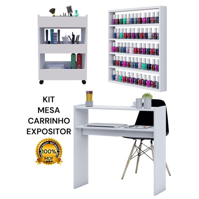 Kit Mesa de Manicure Carrinho Auxiliar Expositor De Esmaltes 100% MDF Salão de Beleza Studio Nail Designer Unha Em Gel