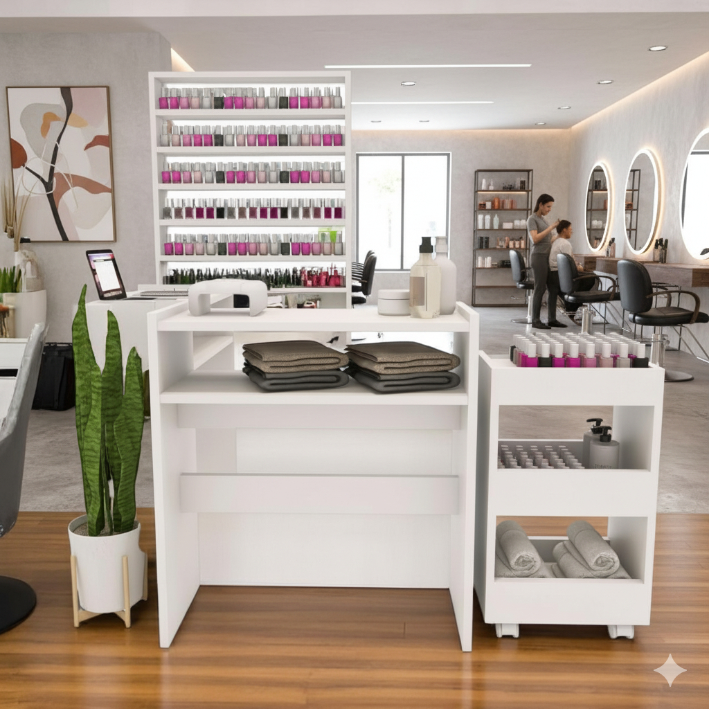 Kit Mesa Manicure Profissional Branco MDP + Carrinho Auxiliar para Salão