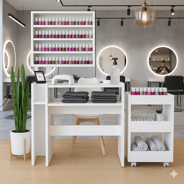 Conjunto Mesa e Carrinho Auxiliar para Manicure – Compacto, Funcional e Elegante! Bem-vindo à DG – Grupo Vec! Transforme seu espaço de atendimento com este conjunto completo para manicure, ideal para quem busca praticidade, organização e um visual profissional. Com design moderno e compacto, ele é perfeito para salões, estúdios de beleza ou uso doméstico. Mesa para Manicure Medidas: Comprimento: 70 cm Largura: 30 cm Altura: 77 cm Material: MDP de 15 mm – leve, resistente e com excelente acabamento. Cor: Branco – versátil e fácil de combinar com qualquer decoração. Acompanha: Kit de montagem com parafusos Pés da mesa Tapa-furo para acabamento limpo Diferenciais: 1 prateleira inferior para organizar materiais Estrutura firme que não balança durante o uso Suporta até 15 kg Carrinho Auxiliar para Manicure Medidas: Altura: 65 cm Largura: 39 cm Profundidade: 30 cm Espaço entre prateleiras: 19 cm Altura útil entre prateleiras: 24,5 cm Capacidade de carga: até 15 kg Peso: 6,9 kg Ideal para organizar esmaltes, acessórios e utensílios com praticidade. NÃO ACOMPANHA O EXPOSITOR DE ESMALTES!! Este conjunto é a escolha certa para quem busca um ambiente organizado, funcional e com ótimo custo-benefício. Aproveite para oferecer um atendimento mais profissional e confortável às suas clientes!
