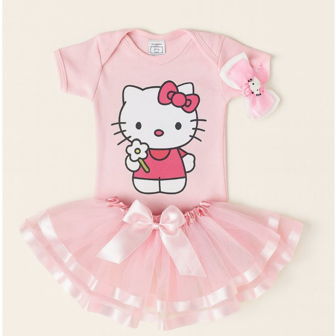 Kit Mesversário Hello Kitty Body Bebê com Tule de Luxo e Laço Fantasia