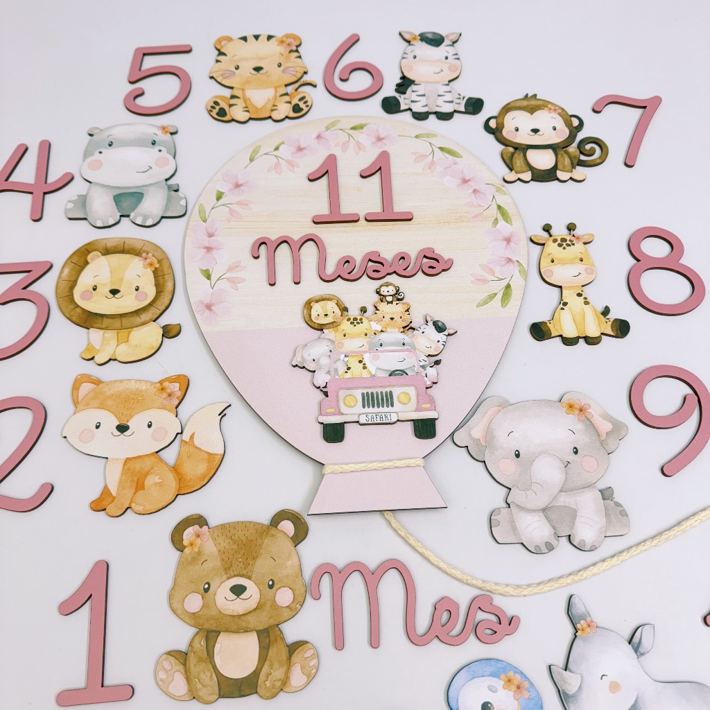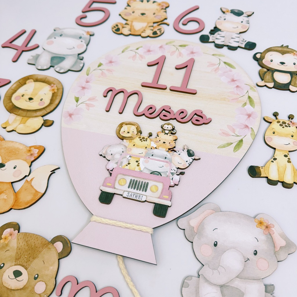 Kit Mesversario Safari Balão Rosa - 29 Itens Para Fotos Mensais Menina
