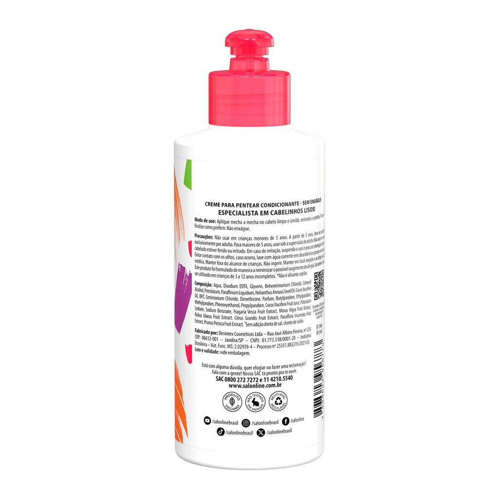 O kit contém 1 Shampoo Morango Meu Liso Kids 300ml, 1 Condicionador 200ml, 1 Creme para Pentear 250ml e 1 Spray Desembaraçante 240ml, a combinação perfeita para cuidar dos cabelos lisos das crianças com hidratação, desembaraço e brilho. <>INDICAÇÕES$& Para quais tipos de cabelo? Liso Qual a indicação? ressecado, sem brilho, com frizz Pode usar a partir de quantos anos? A partir de 03 anos. <>ATIVOS$& Quais os principais ativos? Kit Shampoo + Condicionador Meu Liso Kids Extrato de morango: Aliado da hidratação dos cabelos, proporciona fios macios e brilhosos. Água de coco:Repõe os nutrientes dos fios e potencializa a hidratação. Spray Desembaraçante e Creme para Pentear Meu Liso Kids Frutas vermelhas, amarelas e água de coco: garantem desembaraço perfeito, retiram os nós dos cabelos, hidratam e dão brilho intenso aos cabelos. <>MODO DE USO$& Qual a melhor forma de usar? Kit Shampoo e Condicionador Kids Hidratação Shampoo Meu Liso Kids Aplique o Shampoo sobre o cabelo molhado dos pequenos, evitando o rostinho. Massageie suavemente e enxágue bem. Condicionador Meu Liso Kids Após lavar os cabelos com o Shampoo, aplique o Condicionador no cabelo molhado, evitando o rostinho. Aguarde alguns instantes e enxágue bem. Spray Desembaraçante e Creme para pentear Com o cabelo limpo e úmido, aplique o produto mecha a mecha, uniformemente, do comprimento às pontas. Desembarace com um pente. A quantidade ideal a ser aplicada dependerá da quantidade de cabelo e do comprimento dos fios. Salon Line Recomenda O Creme para Pentear Meu Lisinho Kids possui proteção UV, ideal para proteger os cabelos na praia ou na piscina. <>CARACTERÍSTICAS$& É produto vegano? Todos os produtos são veganos. É liberado? Nenhum dos produtos são liberados.