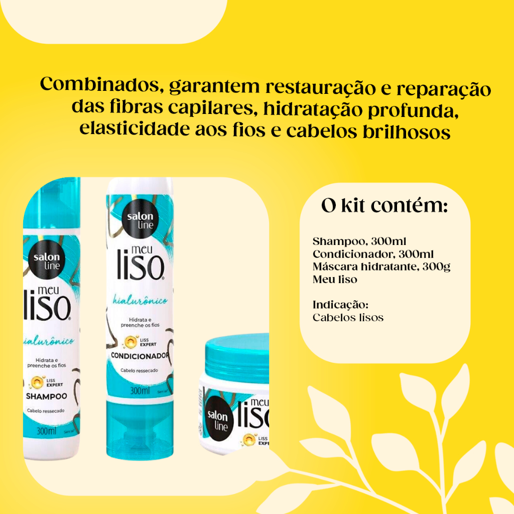 O Kit Salon Line Meu Liso conta com 1 Shampoo, 1 Condicionador e 1 Máscara de Hidratação da linha SPA Capilar Ácido Hialurônico. Combinados, garantem restauração e reparação das fibras capilares, hidratação profunda, elasticidade aos fios e cabelos brilhosos. INDICAÇÕES Para quais tipos de cabelo? Cabelos lisos naturais, alisados e relaxados. Qual a indicação? Cabelos danificados e quimicamente tratados. . Pode usar a partir de quantos anos? A partir de 12 anos ATIVOS Quais os principais ativos? A linha Meu Liso SPA Capilar Ácido Hialurônico conta com ácido hialurônico para cabelo que garante restauração capilar, reposição de massa e controle do frizz. MODO DE USO Qual a melhor forma de usar? Shampoo Meu Liso SPA Capilar Ácido Hialurônico Aplique o Shampoo com Ácido Hialurônico no cabelo molhado, massageando suavemente. Enxágue bem. Caso seja necessário, repita a aplicação. Condicionador Meu Liso SPA Capilar Ácido Hialurônico Após lavar o cabelo com o Shampoo Ácido Hialurônico Meu Liso Spa Capilar, aplique o Condicionador com Ácido Hialurônico nos cabelos úmidos, mecha a mecha, do comprimento às pontas dos fios. Enxágue bem. Máscara de Hidratação Meu Liso SPA Capilar Ácido Hialurônico Com o cabelo limpo e úmido, aplique a Máscara Hidratante com Ácido Hialurônico mecha por mecha, massageando no sentido da raiz para as pontas. Deixe agir entre 5 e 10 minutos. Enxágue bem. CARACTERÍSTICAS É produto vegano? Os produtos com Ácido Hialurônico da linha Meu Liso Spa Capilar são veganos. É liberado? Os produtos não são liberados, mas não possuem sal e parabenos.