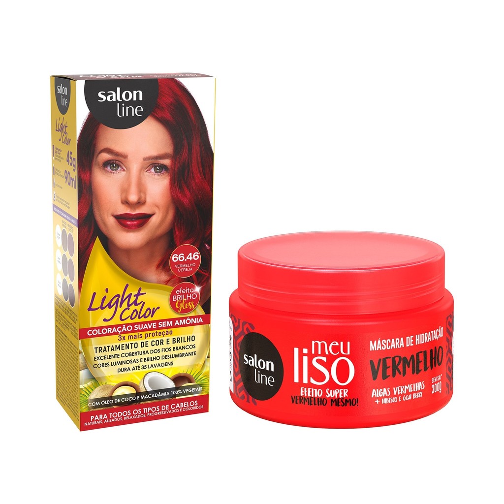 O Kit Salon Line Meu Liso Super Vermelho + Light Color 66.46 Vermelho Cereja conta com 1 Máscara de Hidratação Meu Liso Super Vermelho, que mantém o tom intenso e os fios hidratados, e 1 coloração Light Color 66.46 Vermelho Cereja que colore, trata dos cabelos de forma suave e sem amônia, além de garantir brilho gloss e cor intensa.INDICAÇÕESPara quais tipos de cabelo?Cabelos lisos naturais, alisados ou relaxados e cabelos com coloração.Qual a indicação?Cabelos ressecados, desbotados, naturais, com progressiva ou coloridos.Pode usar a partir de quantos anos?A Máscara Meu Liso Super Vermelho pode ser usada a partir de 12 anos. Já a coloração não deve ser usada em crianças.ATIVOSQuais os principais ativos?Máscara Meu Liso Vermelho Super VermelhoA Máscara de Hidratação para Cabelos Vermelhos contém algas vermelhas, hibisco e goji berry que garantem a manutenção do tom vermelho intenso, além de hidratar e fortalecer os fios com efeito profissional.Coloração Light Color 66.46 Vermelho CerejaLight Color é uma coloração sem amônia. Sua fórmula é enriquecida com Óleo de Coco e Macadâmia para tratar e proteger as fibras capilares, deixando os cabelos revitalizados, sedosos e com brilho intenso.MODO DE USOQual a melhor forma de usar?Máscara de Hidratação Meu Liso Vermelho Super VermelhoCom o cabelo limpo e úmido, aplique a Máscara Vermelha Salon Line mecha por mecha, massageando no sentido da raiz para as pontas. Deixe agir de 5 a 10 minutos. Enxágue bem. Pode ser usado com frequência. O resultado final dependerá da cor e tom do vermelho, além do tempo de ação do produto no cabelo. Prefira usar o produto com luvas plásticas para não manchar as mãos durante a aplicação.Coloração Light Color 66.46 Vermelho CerejaAplicação/tempo de ação em cabelos naturais:Aplique a mistura uniformemente nos cabelos mecha por mecha, na raiz, comprimento e pontas. Para cabelos finos, loiros, avermelhados, permanentados, alisados e relaxados, deixe a mistura agir por 15 minutos. Para cabelos normais, grisalhos e escuros, deixe a mistura agir por 20 minutos.Dicas de usoAntes de iniciar a aplicação da Vermelho Cereja 66.46 Light Color, passe um pouco de creme hidratante na testa (próximo aos cabelos), orelhas e nuca para facilitar a retirada da coloração e evitar que a pigmentação da tinta de cabelo vermelho manche sua pele.Salon Line recomendaAntes da aplicação da coloração, é importante realizar o teste de sensibilidade e o teste de mecha para detectar possíveis reações adversas e determinar o tempo de aplicação do produto e o resultado da cor. Por isso, não deixe de conferir a bula que acompanha a Coloração Light Color Vermelho Cerveja.CARACTERÍSTICASÉ produto vegano?A Máscara Meu Liso Vermelho Super Vermelho é vegana. A Coloração para Cabelo Vermelho Cereja Light Color 66.46 não é.É liberado?A Máscara Salon Line Meu Liso Vermelho Super Vermelho não é liberada, mas não contém parabenos. Já a Coloração Light Color 66.46 Vermelho Cereja é liberada.