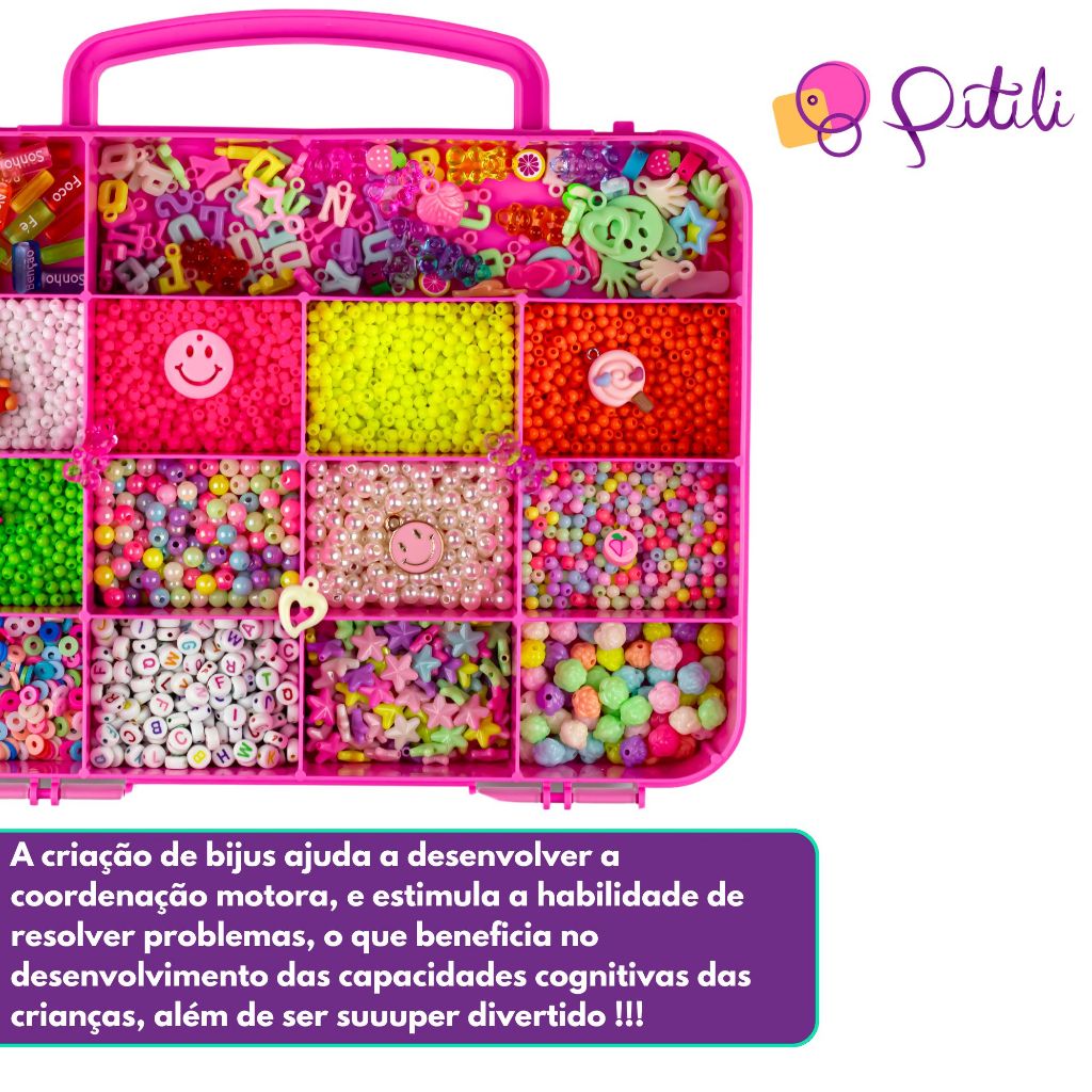 Kit Maleta de Miçangas Para Fazer Pulseira 4000 Peças + Fio Este kit de miçangas infantil com 4000 peças é perfeito para crianças que amam criar artesanatos e bijuterias. Com uma grande variedade de cores, formas e tamanhos de miçangas, este kit oferece uma ampla gama de possibilidades de criação, desde colares e pulseiras até pingentes, tornozeleiras e strap phones. Além disso, o kit é ideal para quem deseja presentear alguém especial que goste desse tipo de atividade. As crianças podem passar horas se divertindo e criando com as miçangas, estimulando sua criatividade e habilidades manuais. O kit de miçangas infantil com 4000 peças é feito com materiais de alta qualidade e seguros para as crianças, garantindo a durabilidade e a segurança durante o uso. As miçangas são fáceis de manusear e permitem que as crianças desenvolvam suas habilidades motoras finas e sua coordenação olho-mão. Com este kit, as crianças terão a oportunidade de explorar sua imaginação e criar peças únicas e personalizadas. É um presente perfeito para aniversários, festas e outras ocasiões especiais. Então, se você está procurando um kit de miçangas de alta qualidade para presentear uma criança ou simplesmente para incentivar sua criatividade, este kit de miçangas infantil com 4000 peças é a escolha perfeita. O Kit inclui: - 4000 Peças entre miçangas de acrilico,bolas 4 e 6mm pingentes, e entremeios diversos - 1 Caixa organizadora com 12 divisórias - 10 Metros de fio de silicone - 1 Caneta Kawaii exclusiva A cor do produto pode variar dependendo das configurações do seu monitor e o lote da fabricação. Nossa equipe esta sempre pronta para atende-los da melhor forma possível, qualquer dúvida entrar em contato pelo chat. Nos torne seu principal fornecedor, e fique por dentro das mais novas tendências do ramo do artesanato e confecções, sempre com os melhores produtos e preços do mercado. obs: Os modelos e cores dos itens podem variar conforme a disponibilidade, mas sempre dentro do mesmo padrão .---------------------------------------------------------------------------------------------------------------------- - Produto a pronta entrega com postagem em até 24h. - Adquira já o seu. - A Pitili agradece a preferência.