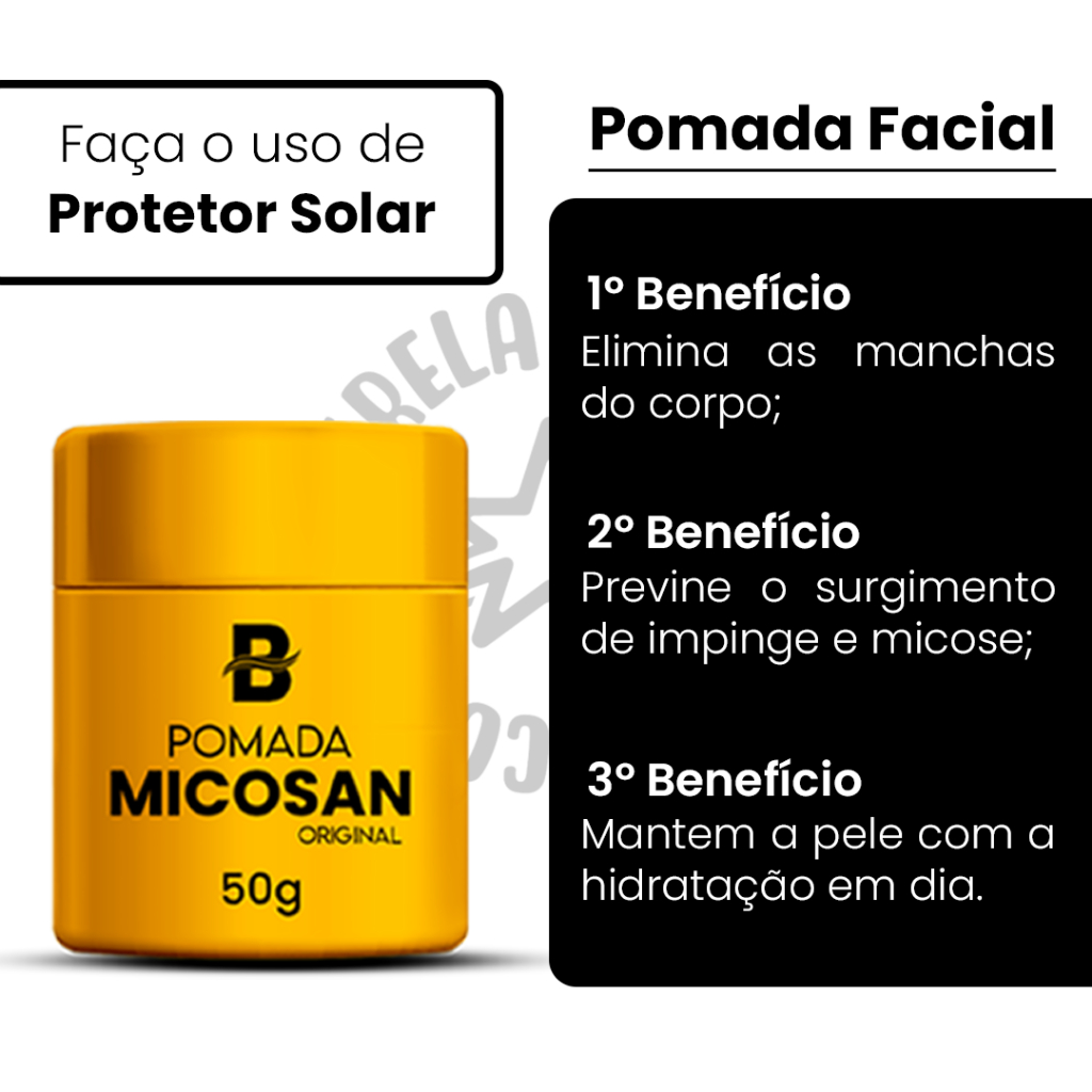 O Kit Micosan Mikoziu é a solução perfeita Para Manchas Na Pele e Micoses O Sabonete Micosan Mikoziu é um produto exclusivo que ajuda a reduzir a inflamação, coceira e até mesmo clarear manchas escuras na pele causadas por doenças, como micose, frieiras, cicatrização de feridas, picadas de insetos e muito mais. Pode até ajudar a reduzir a aparência de axilas, cotovelos, tornozelos e escurecimento ou descoloração do pescoço. Composição do Sabonete em Barra Óleos vegetais saponificado, enxofre e glicerina. A Pomada Micosan Mikoziu são produtos exclusivos que ajuda a reduzir a inflamação, coceira e até mesmo clarear manchas escuras na pele causadas por muitas doenças, como micose, frieiras, cicatrização de feridas, picadas de insetos e muito mais. Pode até ajudar a reduzir a aparência de axilas, cotovelos, tornozelos e escurecimento ou descoloração do pescoço. Composição da Pomada Aqua (água), sorbitan stearate (estearato de sorbitano), paraffinum liquidum (óleo mineral), panthenol (pantenol), prunus amygdalus dulcis oil (óleo de amêndoas), cetearyl alcohol (álcool cetoestearílico).