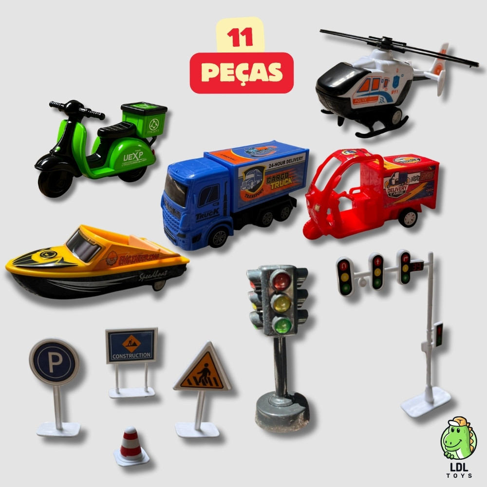 Kit Mini Cidade Carrinhos Moto Barco Helicóptero Caminhão 11 Peças Trânsito Infantil Criança Menino