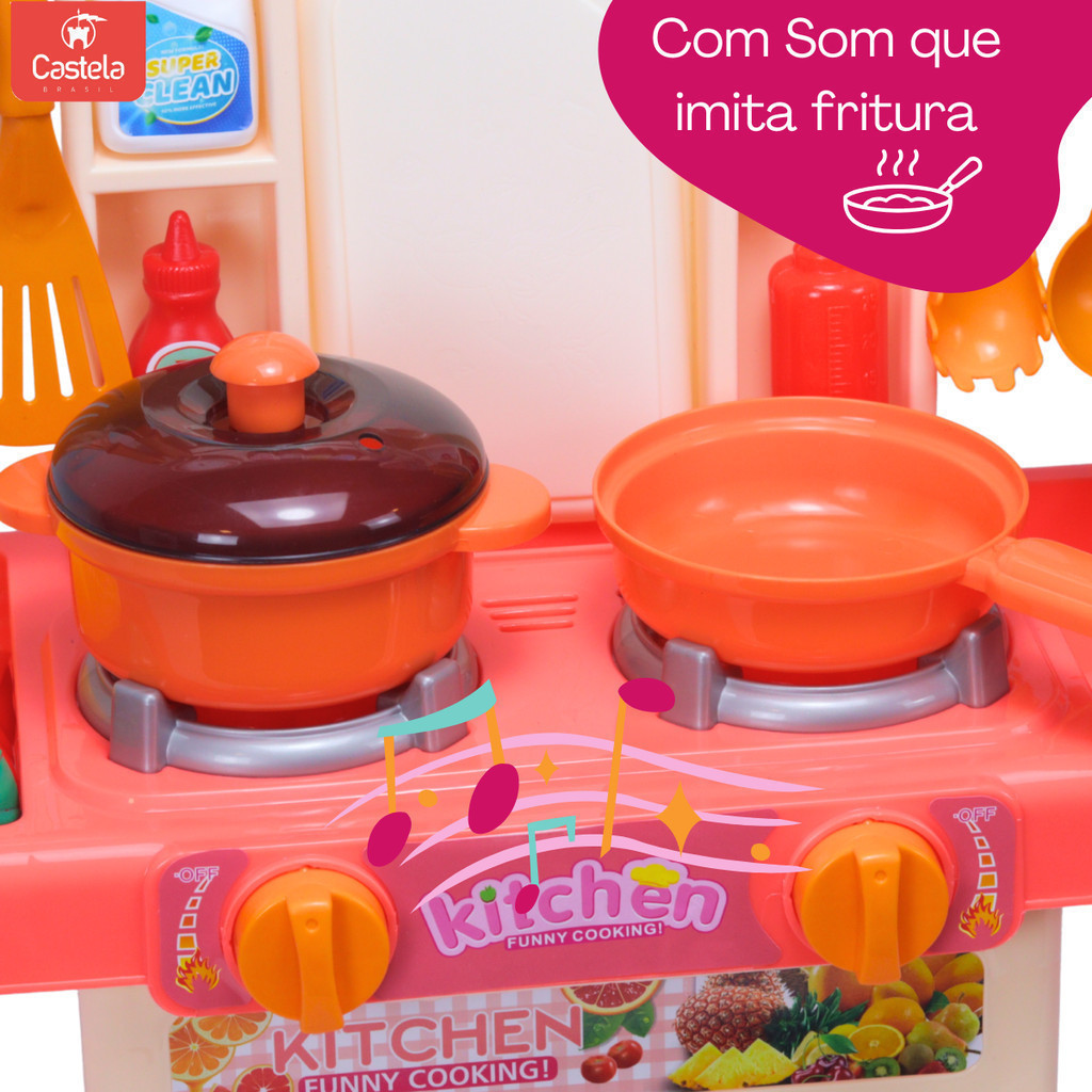 Kit Mini Cozinha Com Fogão Solta Água Tem Luz e Som Rosa Com 16 Acessórios - Castela