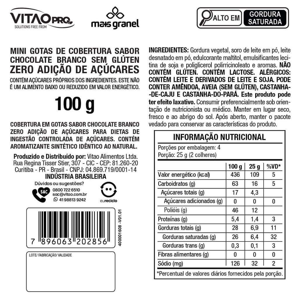 Desfrute da qualidade excepcional das Mini Gotas de Cobertura sabor Chocolate Branco Vegano Zero Açúcar VitaoPRO 100g. Com um sabor equilibrado e envolvente, este chocolate vegano é cuidadosamente elaborado, proporcionando uma experiência única para os apreciadores de chocolate branco, sem adição de açúcar sem lactose e sem glúten. Uma alternativa prática e deliciosa para receitas que respeitam dietas especiais e priorizam qualidade. Desenvolvido para uso profissional no setor de alimentação, o chocolate da Vitao destaca-se por sua versatilidade, sendo uma adição perfeita em diversas receitas, desde confeitaria até sobremesas gourmet. Sua textura cremosa e sabor inconfundível fazem dele uma escolha premium para elevar o padrão das suas criações culinárias de forma mais saudável. Formuladas para resistir ao calor do forno e adicionar qualidade aos seus pratos sem comprometer suas preferências alimentares. vetes. INGREDIENTES: Gordura vegetal, leite de arroz em pó, leite de coco em pó, cúrcuma, edulcorante maltitol, emulsificantes lecitina de soja e poliglicerol polirricinoleato e aromas. ALÉRGICOS: CONTÉM DERIVADO DE SOJA. PODE CONTER AMÊNDOA, AVEIA (SEM GLÚTEN), CASTANHA-DE-CAJU, CASTANHA-DO-PARÁ E AVELÃ. NÃO CONTÉM GLÚTEN. NÃO CONTÉM LACTOSE. SEM GLÚTEN, ZERO ADIÇÃO DE AÇÚCARES, SEM LACTOSE, VEGANO.