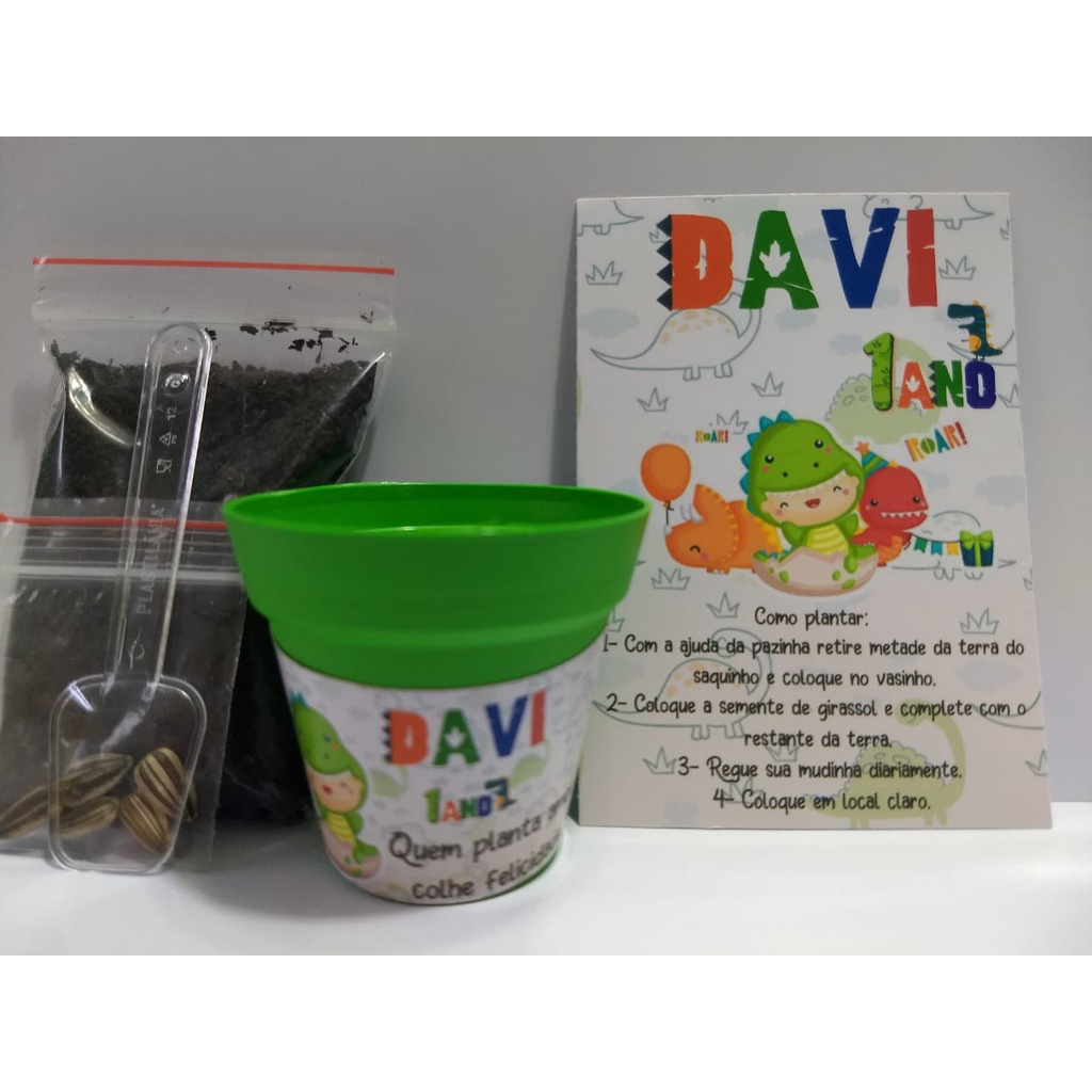 Kit jardinagem completo personalizado, contendo: 01 vasinho de plástico (redondo 5 cm altura) aproximadamente. 01 saquinho com terra vegetal . 01 saquinho com semente de girassol. 01 manual de instruções de como plantar. 01 pazinha de plástico. Embalados em saquinhos transparente, com fita e tag de agradecimento. Personalizamos para qualquer tema. *** Após a compra efetuada envie via mensagem do próprio pedido os dados para personalização: nome, idade e tema*** Cores disponíveis do vaso (sempre consultar disponibilidade): - Azul claro, azul escuro, rosa, vermelho, amarelo, verde claro, verde escuro, laranja, lilás e branco. *** ATENÇÃO, o kit segue desmontado pelo volume e risco de danos no transporte. Vasos seguem empilhados e devidamente etiquetados, a terra já nos seus saquinhos individuais, assim como as sementinhas. É só colocar dentro dos vasinhos conforme modelo enviado pronto junto dentro do saquinho celofane *** OBS: temos opção de kits com vasinhos de 5 cm redondo e de 9 cm quadrado, visite nossa página. PARA OUTRAS QUANTIDADES VISITE NOSSA PÁGINA BOLLER PERSONALIZADOS OU ENTRE EM CONTATO CONOSCO!