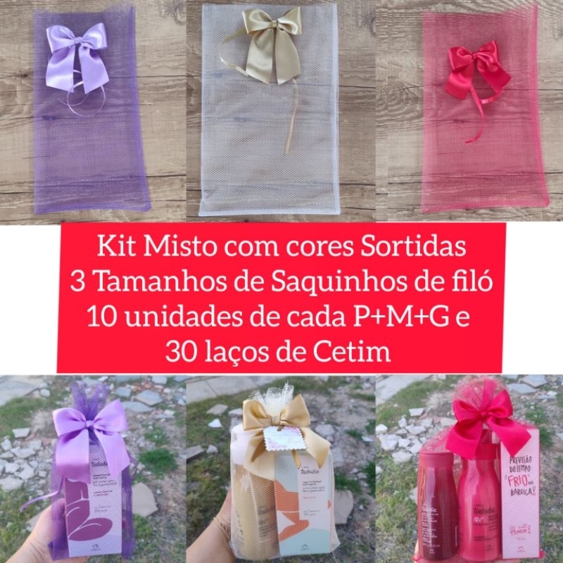 Kit Misto 3 tamanhos de Embalagens de Saquinhos de Filó e Laços de Cetim Cores Sortidas