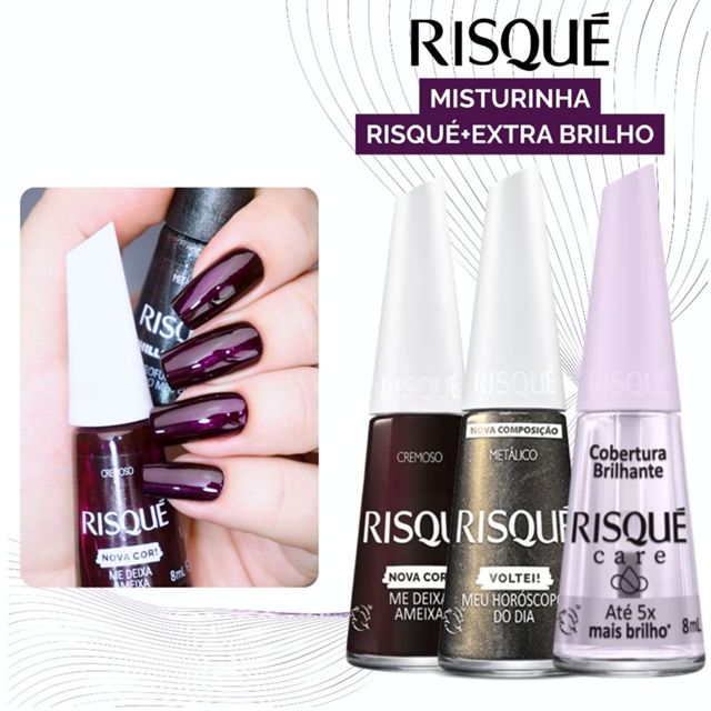 | Kit Misturinha Risqué Combinação Perfeita Esmaltes Risqué Cremosos ... este produto | R$ 16,50 | 38% | 4.9/5 | 186 |