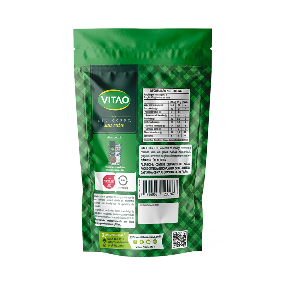 O mix de grãos e sementes Vitao é composto por uma variada combinação de sementes como: Linhaça marrom e dourada, chia em grãos (salvia hispanica), gergelim, sementes de girassol e quinoa em grãos. Esses ingredientes são selecionados pela sua alta qualidade e oferecem um sabor diferenciado, além de trazer praticidade e benefícios para a saúde. Esse mix de grãos e sementes é muito versátil e pode ser utilizado de diversas maneiras na culinária. Ele é ideal para adicionar em saladas, pois acrescenta textura e um toque nutritivo aos pratos. Além disso, pode ser utilizado como ingrediente em receitas como pães, bolos e tortas, conferindo um sabor especial e aumentando o valor nutricional das preparações. Ao consumir o mix de grãos e sementes Vitao, você estará adicionando uma variedade de nutrientes importantes à sua dieta, como ômega-3, fibras, proteínas e minerais. Esses componentes contribuem para a saúde do coração, auxiliam no funcionamento do intestino e promovem a sensação de saciedade. INGREDIENTES: Sementes de linhaça marrom e dourada, chia em grãos (Salvia hispanica), gergelim, sementes de girassol e quinoa em grãos. ALÉRGICOS: CONTÉM DERIVADO DE SOJA. PODE CONTER AMÊNDOA, AVEIA (SEM GLÚTEN), CASTANHA-DE-CAJU E CASTANHA-DO-PARÁ. NÃO CONTÉM GLÚTEN. SEM GLÚTEN, FONTE DE FIBRAS.