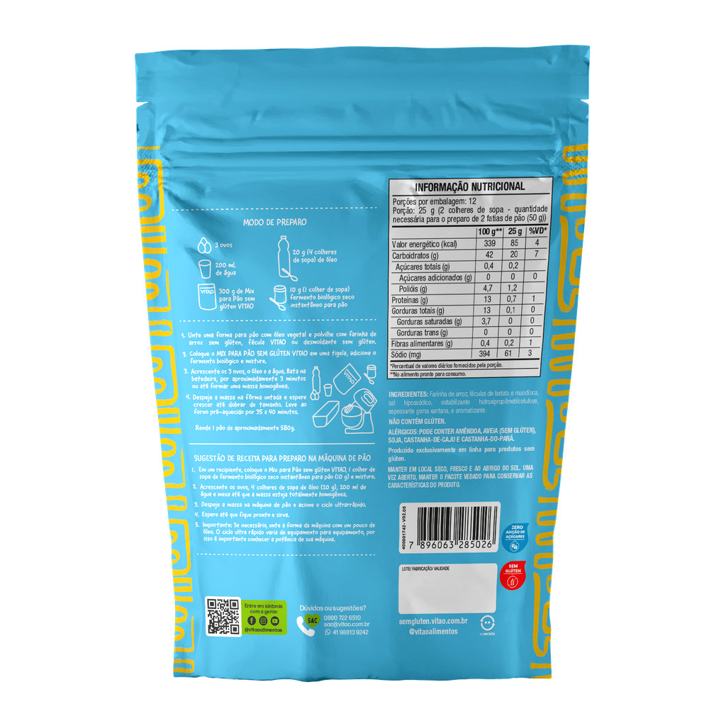 O Mix para Pão Sem Glúten de Aipim Vitao é a escolha perfeita para quem quer unir praticidade e sabor na preparação de pães caseiros. Com uma fórmula cuidadosamente elaborada, ele entrega um pão macio e com o sabor autêntico de um pão tradicional, ideal para quem tem restrições alimentares. A mistura dispensa ingredientes complicados e permite um preparo fácil, garantindo resultados deliciosos e fresquinhos com textura e qualidade incomparáveis. MODO DE PREPARO: - 200 ml de água - 3 ovos - 4 colheres de sopa de óleo (20 g) - 1 colher de sopa (10 g) de fermento biológico seco instantâneo para pão. - 300 g de Mix para Pão sem glúten VITAO. - Unte uma forma para pão com óleo vegetal e polvilhe com farinha de arroz sem glúten ou a fécula VITAO ou desmoldante sem glúten. - Coloque o MIX PARA PÃO SEM GLÚTEN VITAO em uma tigela, adicione o fermento biológico e misture. - Acrescente os 3 ovos, o óleo e a água. Bata na batedeira, por aproximadamente 3 minutos ou até formar uma massa homogênea. - Despeje a massa na fôrma untada e espere crescer até dobrar de tamanho. - Leve ao forno pré-aquecido por 35 a 40 minutos. Rende 1 pão de aproximadamente 580g. PARA PREPARO NA MÁQUINA DE PÃO: - Em um recipiente, coloque o Mix para Pão sem glúten VITAO, 1 colher de sopa de fermento biológico seco instantâneo para pão (10 g) e misture. - Acrescente os ovos, 4 colheres de sopa de óleo (20 g), 200 ml de água e mexa até que a massa esteja totalmente homogênea. - Despeje a massa na máquina de pão e acione o ciclo ultrarrápido. - Espere até que fique pronto e sirva. Importante: Se necessário, unte a forma da máquina com um pouco de óleo. O ciclo ultra rápido varia de equipamento para equipamento, por isso é importante conhecer a potência de sua máquina. INGREDIENTES: Farinha de arroz, féculas de batata e mandioca, sal hipossódico, estabilizante hidroxipropilmetilcelulose, espessante goma xantana, e aromatizante. ALÉRGICOS: PODE CONTER AMÊNDOA, AVEIA (SEM GLÚTEN), SOJA, CASTANHA-DE-CAJU E CASTANHA-DO-PARÁ. NÃO CONTÉM GLÚTEN. SEM GLÚTEN, ZERO ADIÇÃO DE AÇÚCARES.