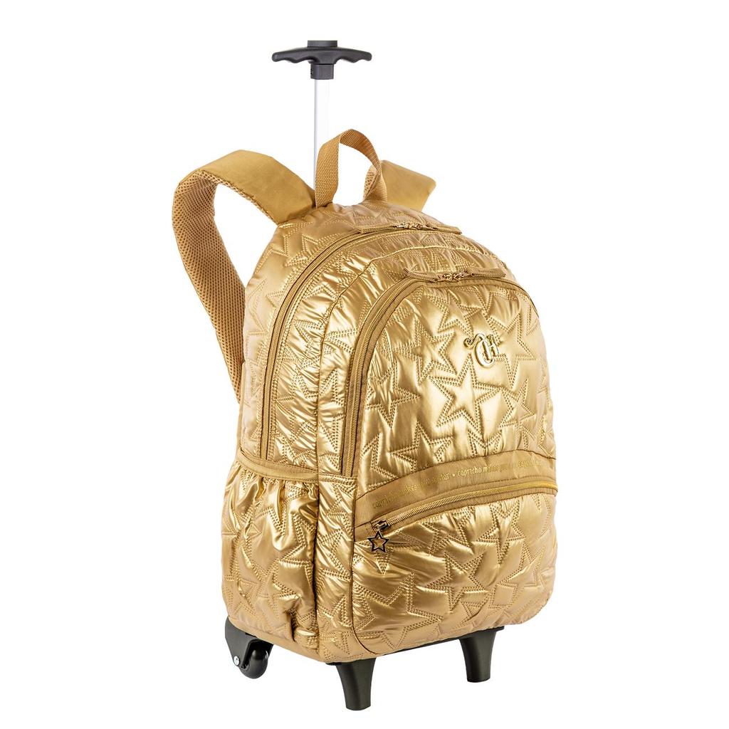 Kit Mochila Carrinho 2 Compartimentos com Lancheira Grande Capricho Estrelas - Dourado