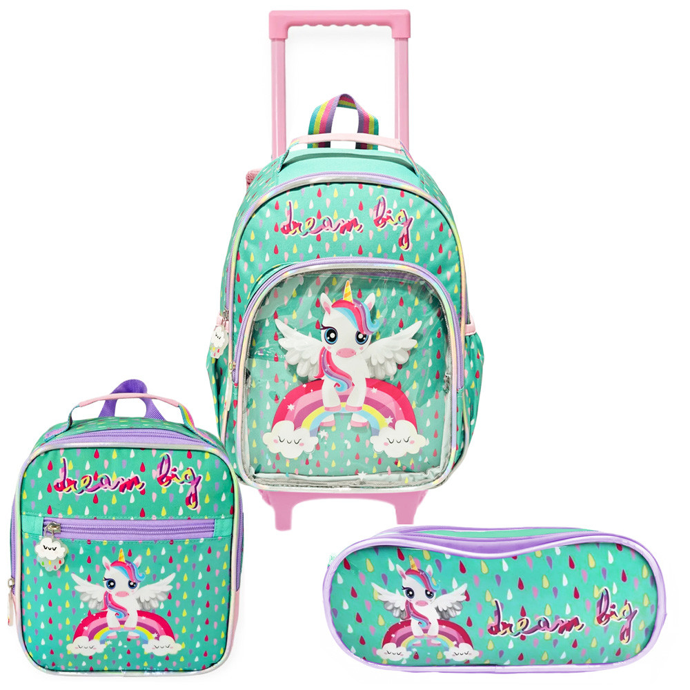 Kit Mochila Carrinho Estojo Lancheira Dream Big Unicórnio