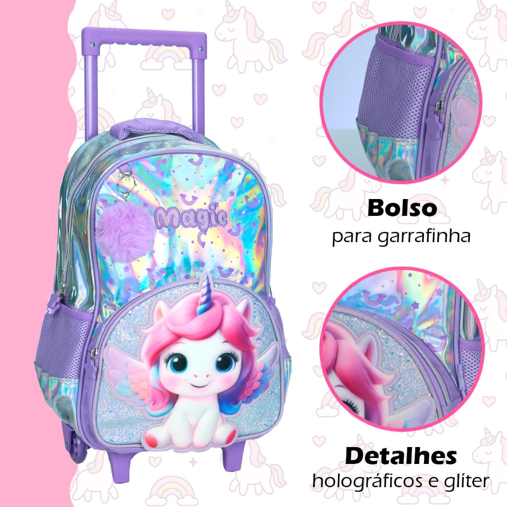 Kit mochila carrinho unicornio holografica lancheira estojo