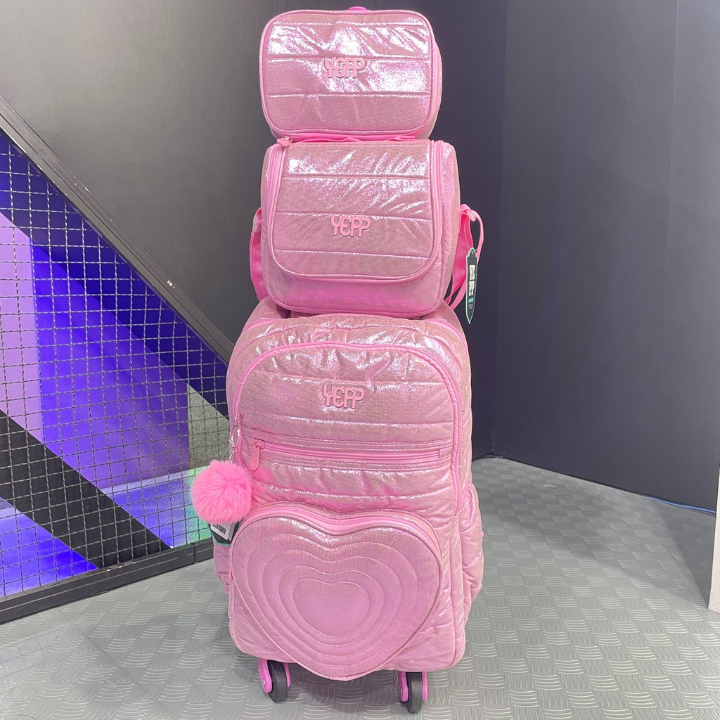 Kit Mochila Coração Glitter Rodinha 360° Feminina Escolar Candy Collor Com Chaveiro Lancheira Térmica e Estojo