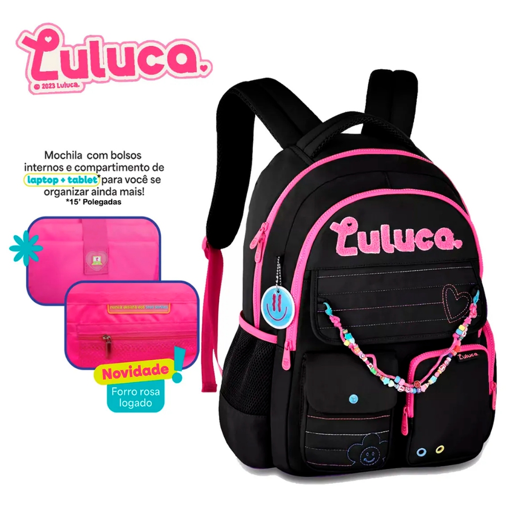 Kit Escolar Completo Luluca: Mochila + Lancheira + Estojo Leve o estilo e o universo da Luluca para o dia a dia escolar com este incrível kit! Inspirado na famosa influenciadora e pensado para trazer praticidade e charme, o conjunto é perfeito para crianças e adolescentes fãs da Luluca. O Kit Contém: Mochila Luluca: Super espaçosa e resistente, com design exclusivo em preto com detalhes em rosa, lilás e preta. Perfeita para carregar cadernos, livros e materiais escolares com organização e estilo. Lancheira Térmica Luluca: Mantém os alimentos frescos e protegidos. Possui alça ajustável para facilitar o transporte. Estojo Personalizado Luluca: Compacto e prático, ideal para lápis, canetas e outros acessórios. Características Principais: Estilo Luluca: Produtos exclusivos com estampas e acabamentos que remetem ao universo da influenciadora. Alta Qualidade: Material durável e fácil de limpar. Conforto e Praticidade: Mochila com alças acolchoadas e lancheira térmica compacta. Dimensões: Mochila: 44cm x 33cm x 14cm Lancheira: 19cm x 24cm x 12cm Estojo: 22cm x 16cm x 6cm Garanta já este kit exclusivo e torne o dia a dia escolar ainda mais divertido e organizado com a marca Luluca! Dúvidas? Estamos à disposição para ajudar!