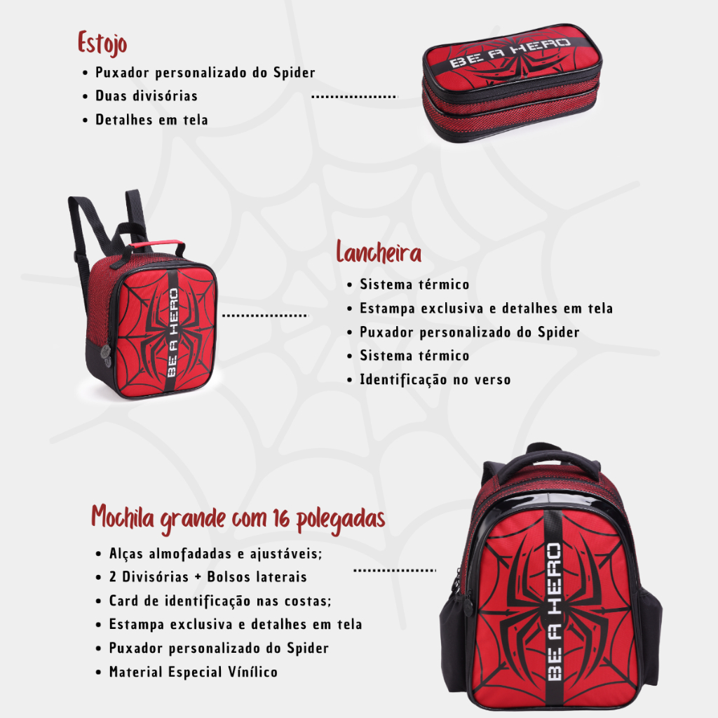 Kit Mochila Costas Grande Escolar Masculina 17l Homem Aranha Com Lancheira E Estojo Spider Hero