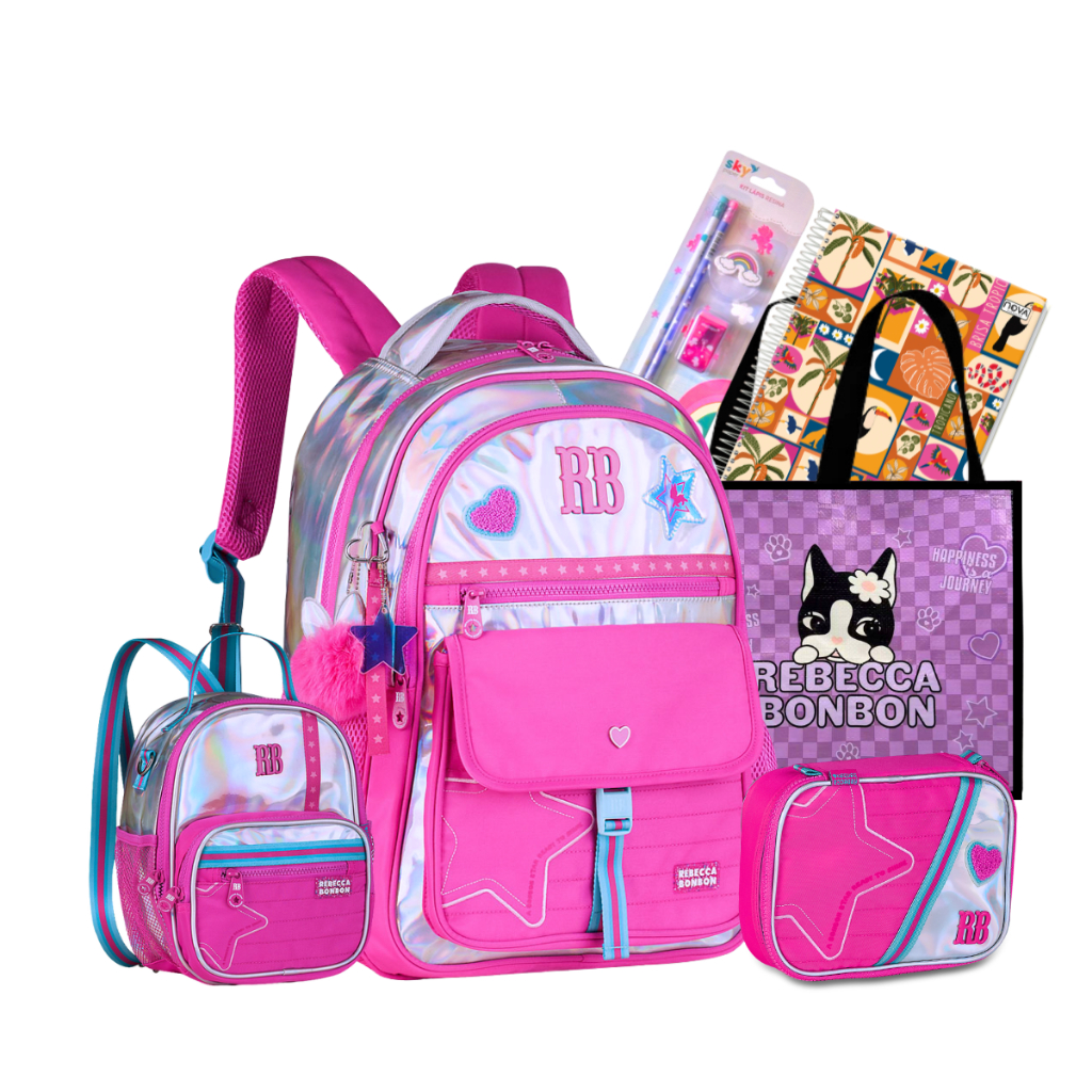 Kit escolar Rebecca Bonbon original, moderno e funcional, ideal para o dia a dia escolar. Mochila com acabamento holográfico, design delicado e detalhes exclusivos da marca. Possui compartimento principal espaçoso, bolso frontal com fecho, bolsos laterais em tela e alças acolchoadas que garantem mais conforto. Acompanha chaveiro decorativo. Medidas da mochila: 44x33x14cm. Lancheira prática com bom espaço interno, ideal para manter os alimentos organizados durante a rotina. Medidas: 20x24x14cm. Estojo compacto e funcional, com fechamento em zíper resistente, perfeito para material escolar. Medidas: 22x16x6cm. Material resistente, fácil limpeza e excelente acabamento. Ótima opção para quem busca qualidade, estilo e durabilidade.
